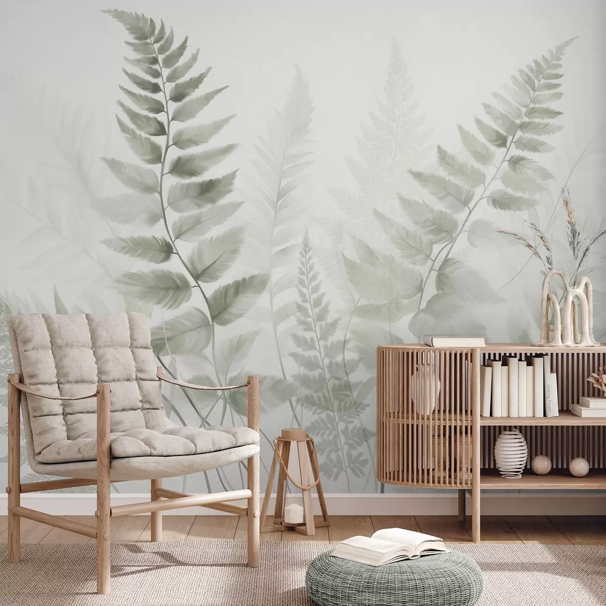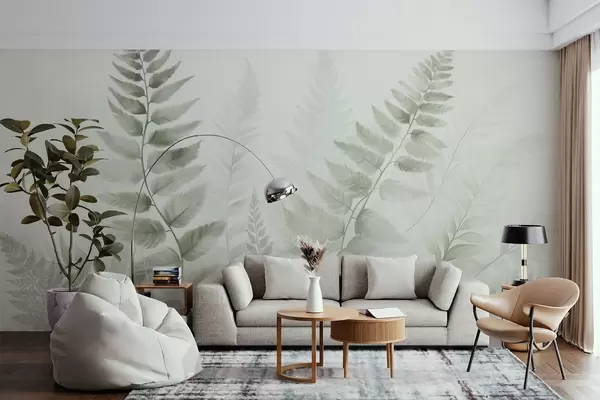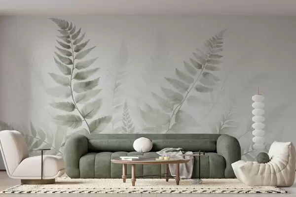 Fototapetak Texturált, szárított páfránylevelek különböző zöld árnyalatokban, puha, világos háttérrel, akvarell stílusban. Nr. w09615v1