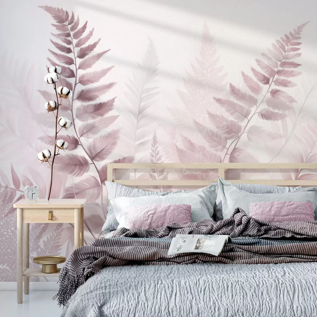 Fototapetak Texturált, szárított páfránylevelek különböző rózsaszín árnyalatokban, puha, világos háttérrel, akvarell stílusban. Nr. w09615v2