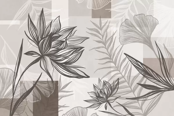 Fototapetak Texturált, stilizált virágok és levelek barna és bézs árnyalatokban, geometrikus háttérrel, vonalas grafika Nr. w09629