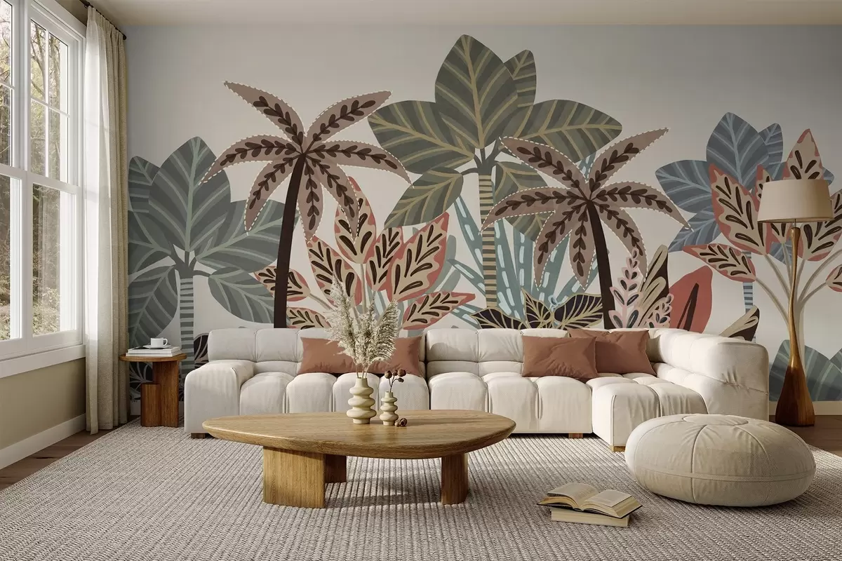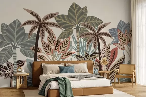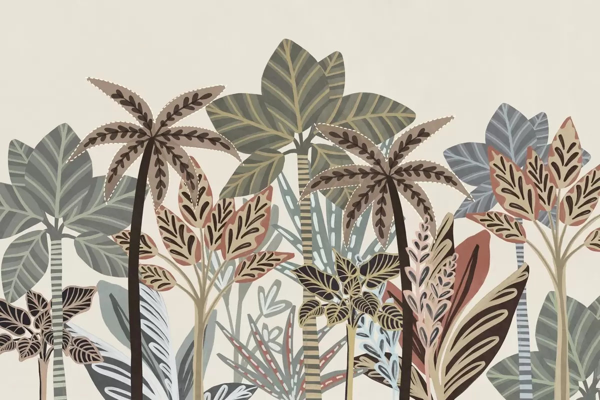 Fototapetak Texturált trópusi növények és pálmafák, tompított színekkel, dekoratív boho stílusban, krém színű háttér előtt Nr. w09639