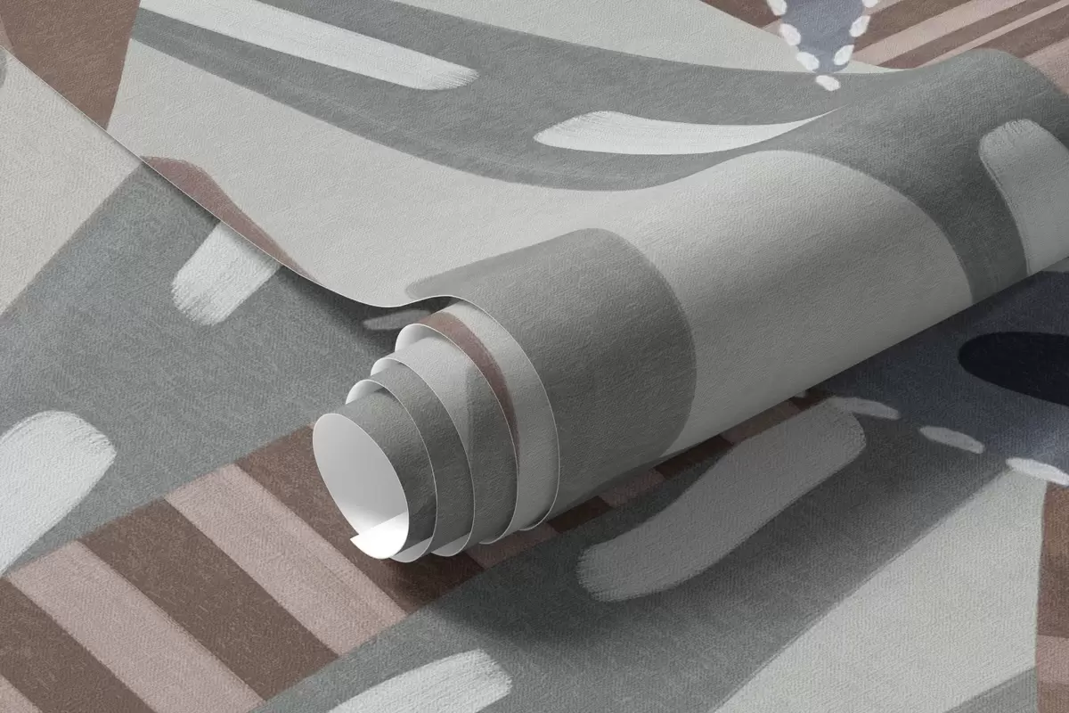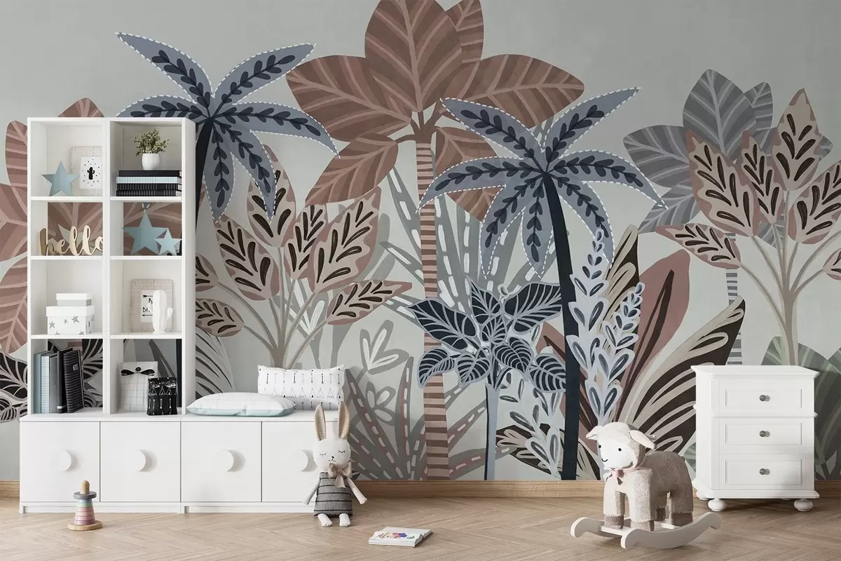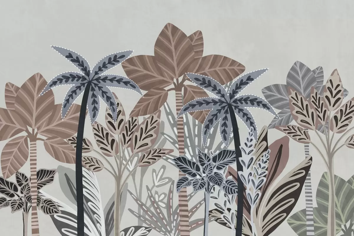 Fototapetak Texturált trópusi növények és pálmafák, tompított színekkel, dekoratív boho stílusban, szürke háttér előtt Nr. w09639v1