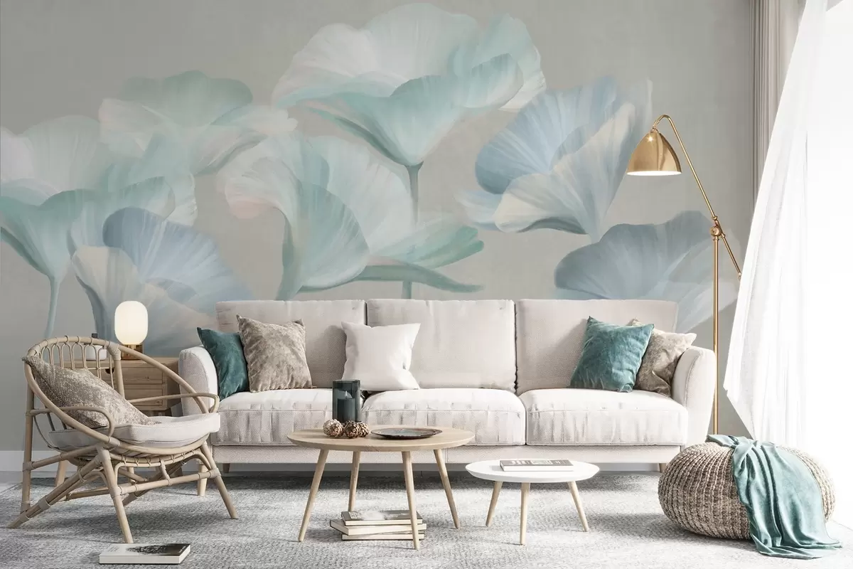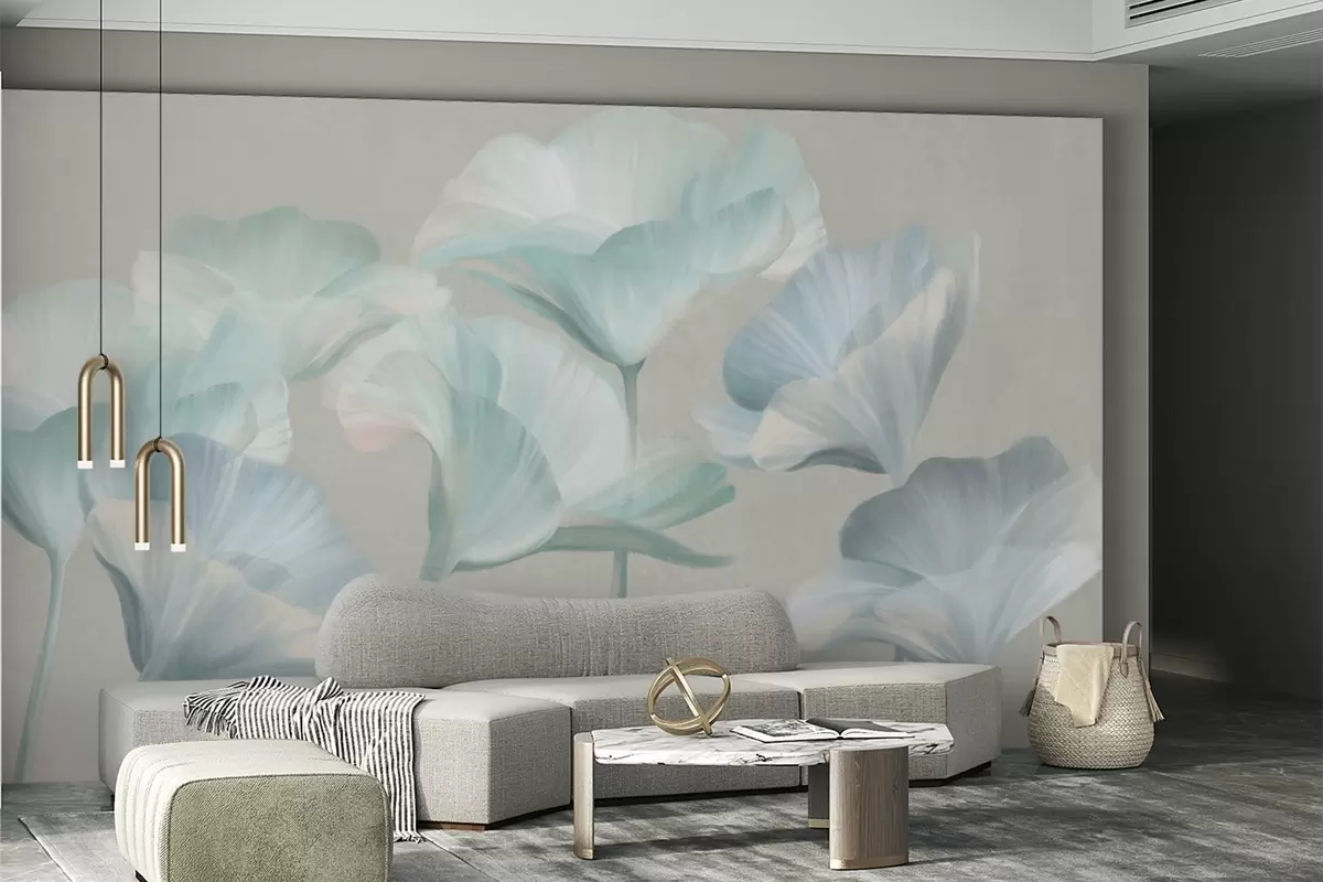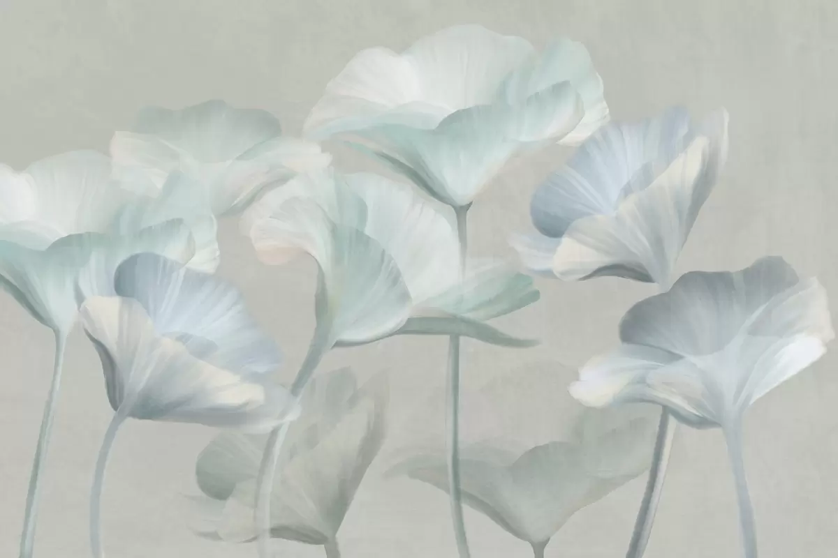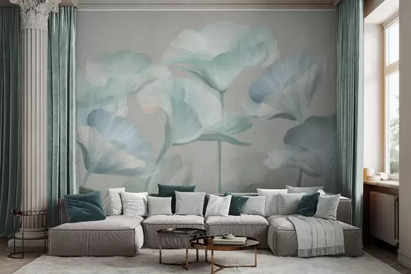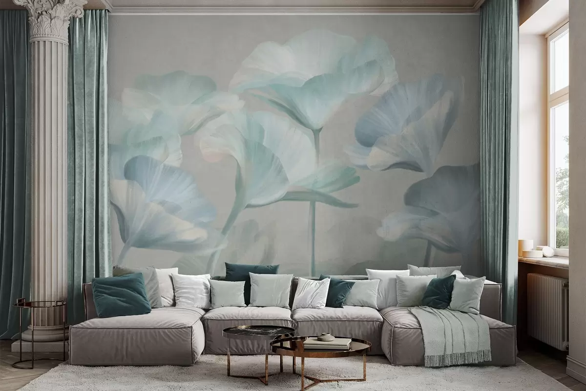 Fototapetak Halvány türkizkék, texturált, áttetsző lótuszvirágok finom szirmokkal, tompa szürke háttér előtt Nr. w09640v2