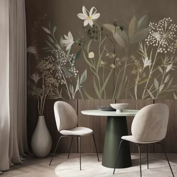 Fototapetak Finom textúrájú vadvirágok és lombok halványzöld és krémes árnyalatokban, barna háttér előtt Nr. w09641v1