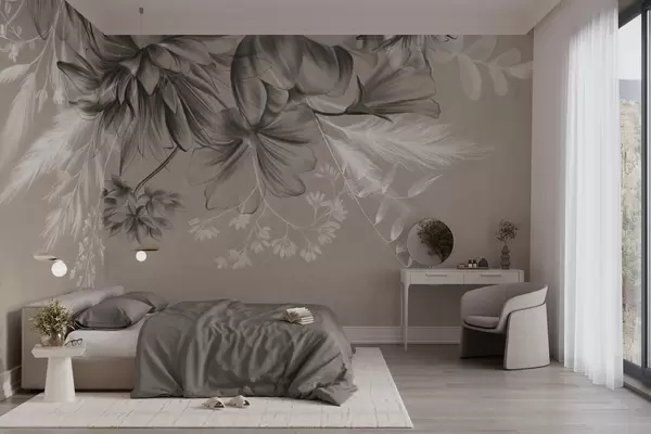 Fototapetak Texturált virágok és páfrányok sötét szürke és fehér árnyalatokban, tompa bézs háttérrel, rajzstílusban Nr. w09644