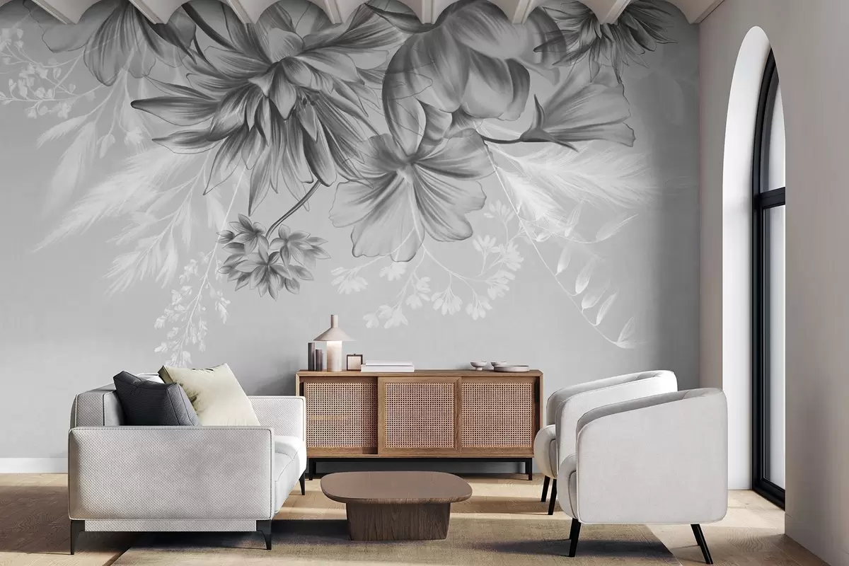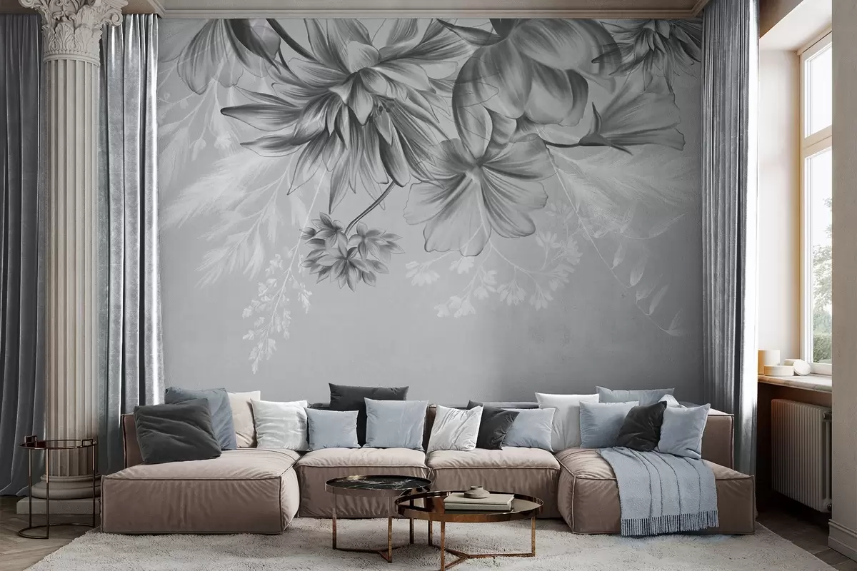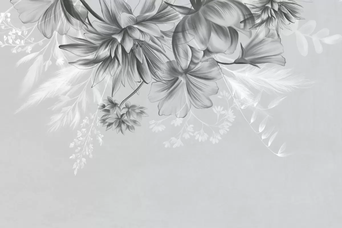 Fototapetak Texturált virágok és páfrányok sötét szürke és fehér árnyalatokban, tompa szürke háttérrel, rajzstílusban Nr. w09644v1