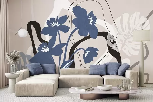 Fototapetak Absztrakt textúrájú kék virágok fehér és fekete formákkal világos bézs háttér előtt, minimalista művészet Nr. w09645