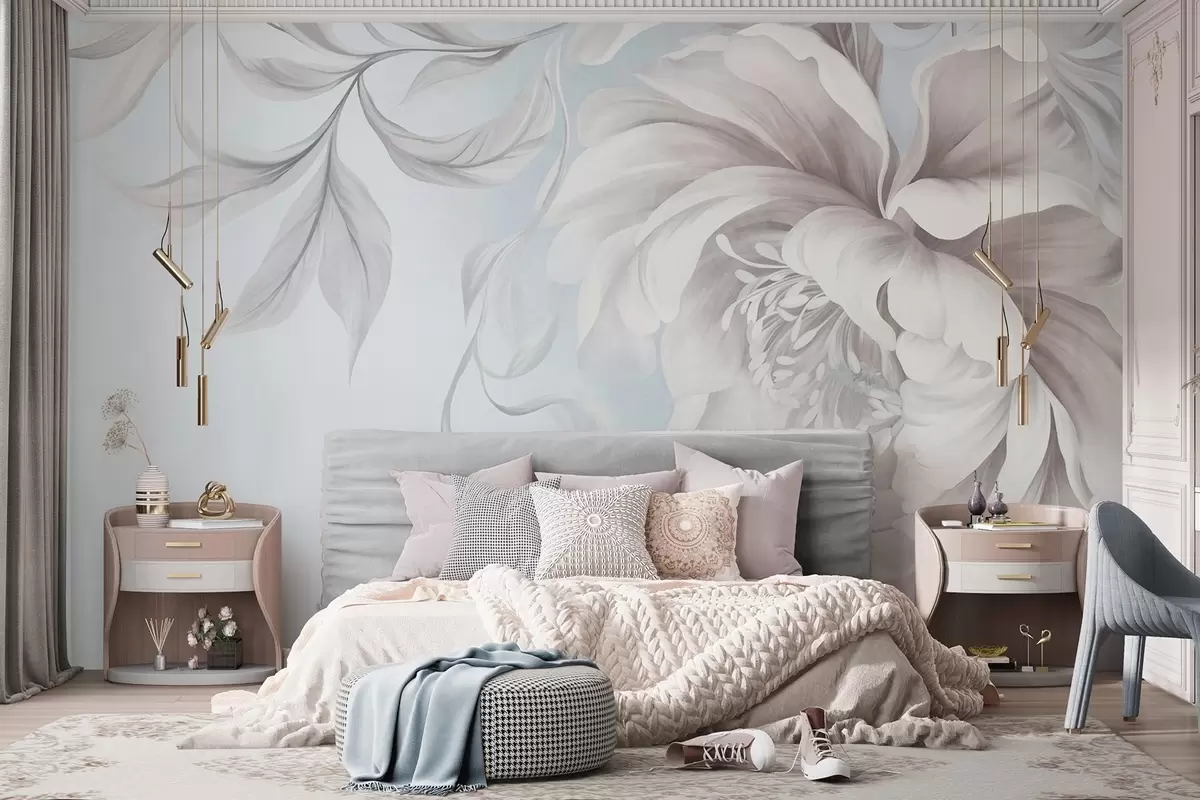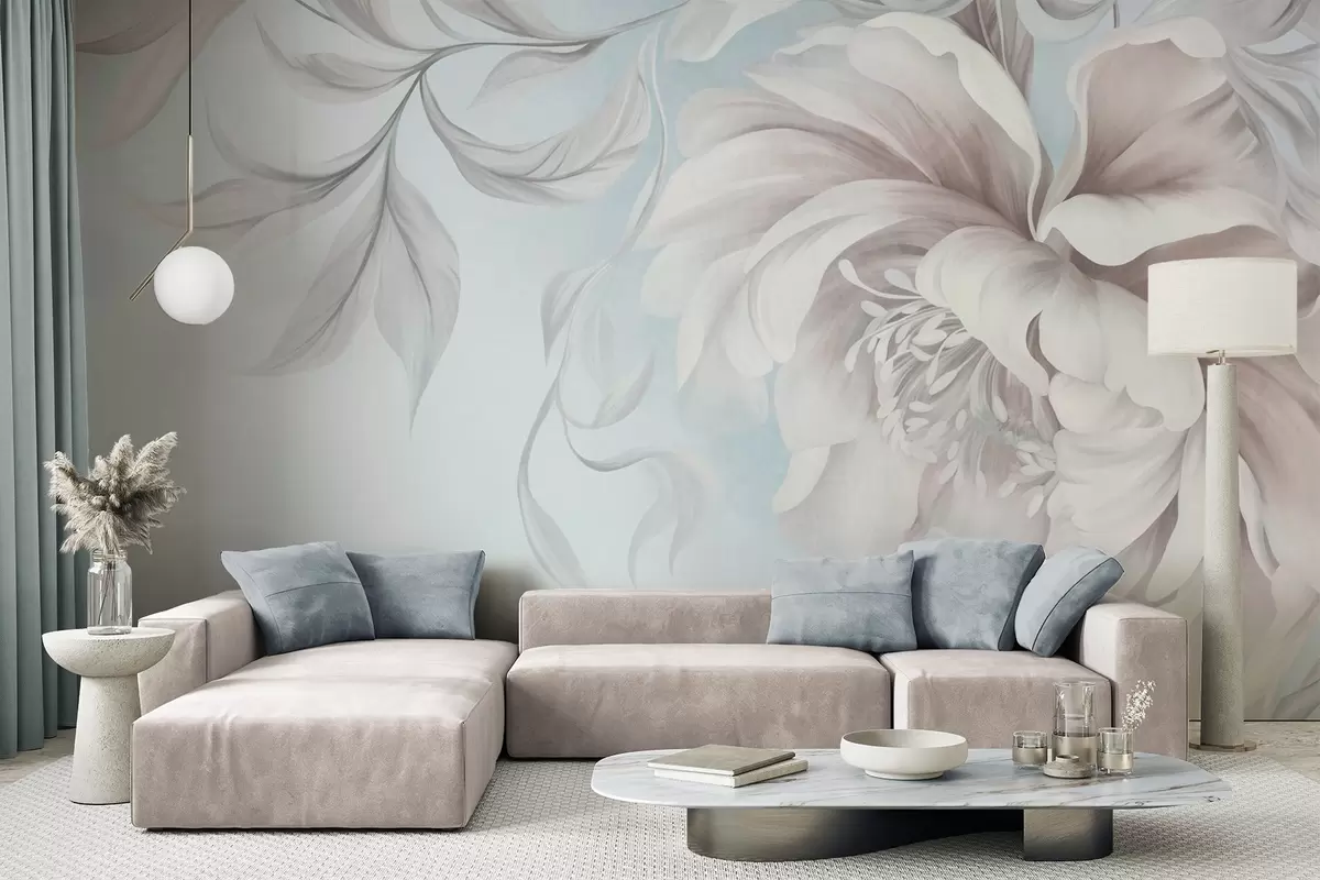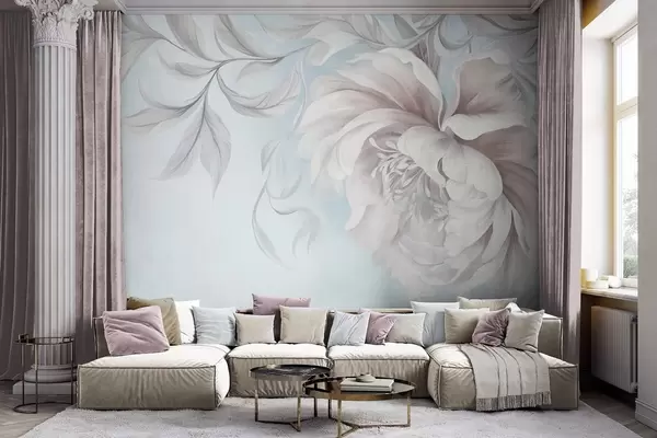 Fototapetak Nagy, dombornyomott pünkösdi rózsa finom szirmokkal és szürke levelekkel, lágy stílusban festve Nr. w09647v1