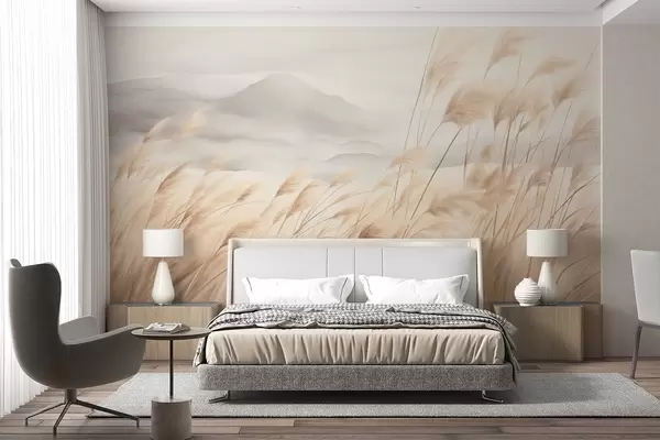 Fototapetak Texturált hegyvidéki táj magas, száraz fűvel, ködös ég alatt Nr. w09649