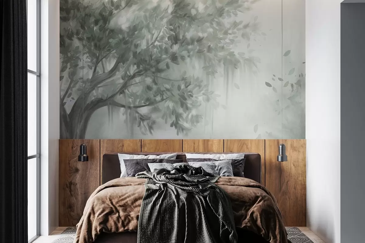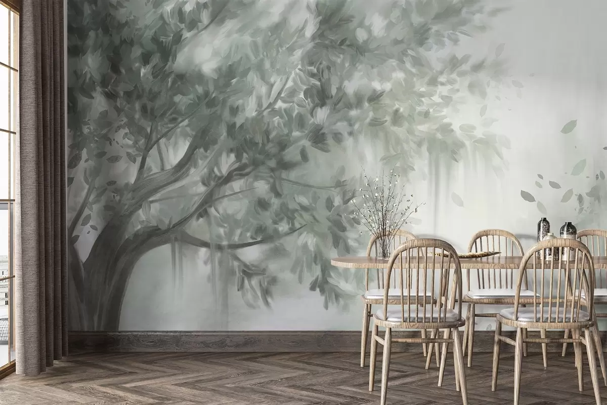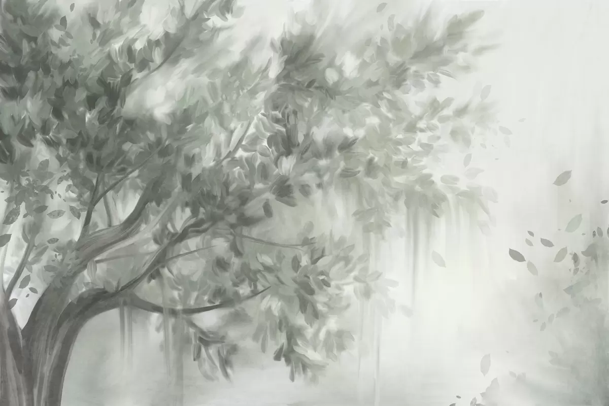 Fototapetak Texturált fa zöld levelekkel és ágakkal, lágy, homályos háttérrel Nr. w09650v1