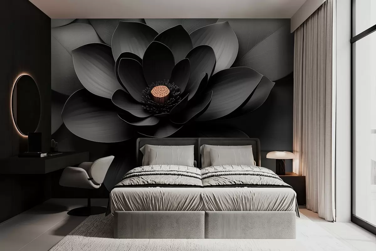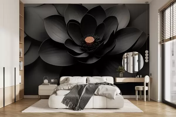 Fototapetak Minimalista fekete virág szirmokkal és kontrasztos, meleg színű közepével Nr. w09721