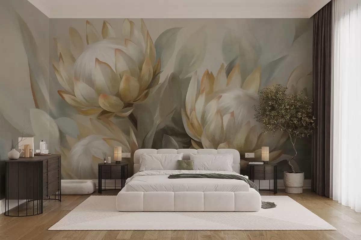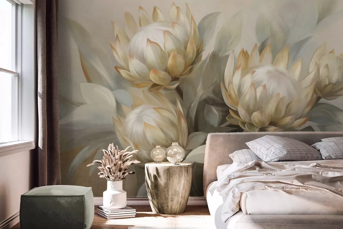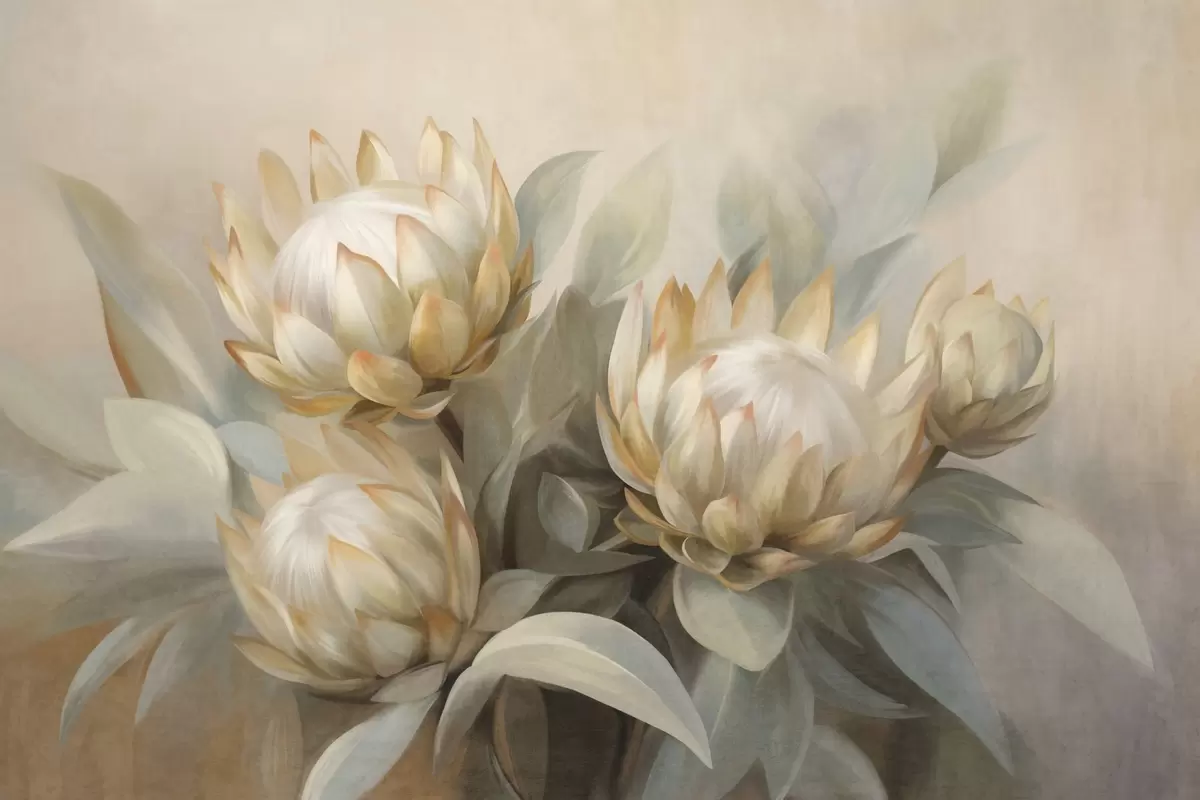 Fototapetak Texturált protea virágok zöld levelekkel és lágy, elmosódott háttérrel Nr. w09738