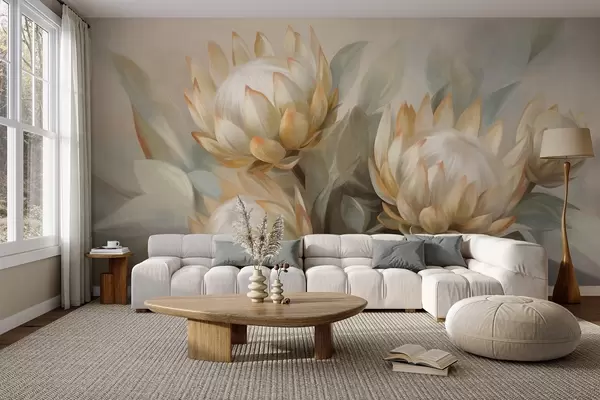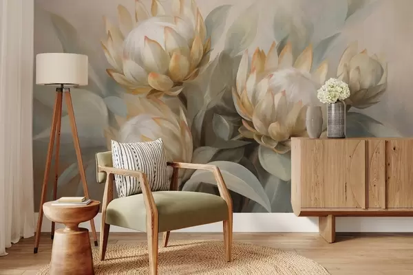 Fototapetak Texturált protea virágok zöld levelekkel és lágy, elmosódott háttérrel Nr. w09738