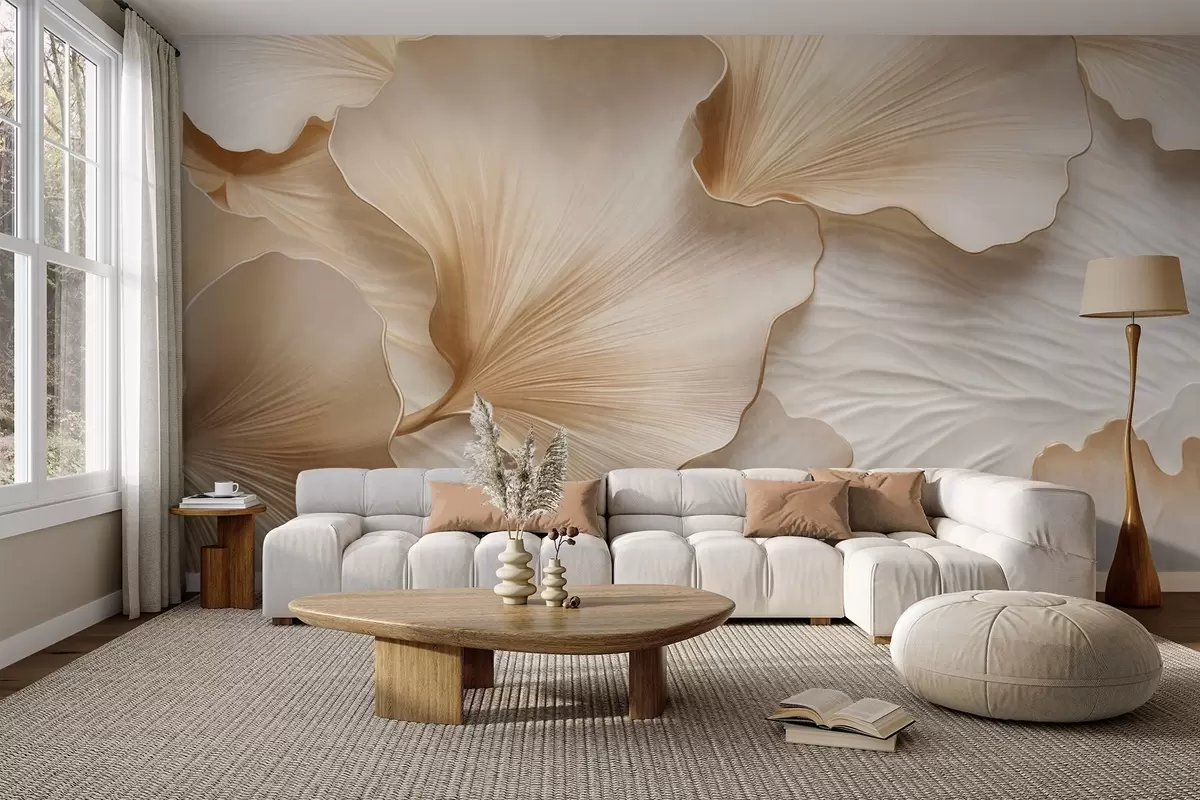 Fototapetak Texturált, bézs és fehér ginkgo levelek szirmok finom organikus nyomtatással Nr. w09741