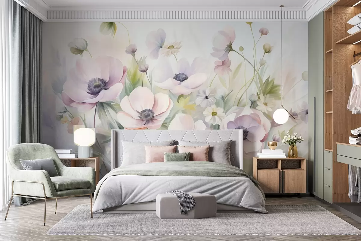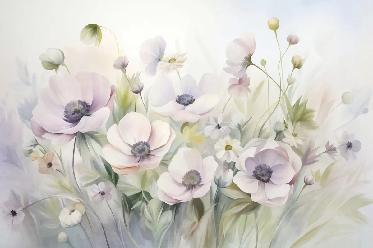 Fototapetak Pasztellrózsaszín és fehér anemone virágok, zöld lombok és apró fehér margaréták mezője Nr. w09742