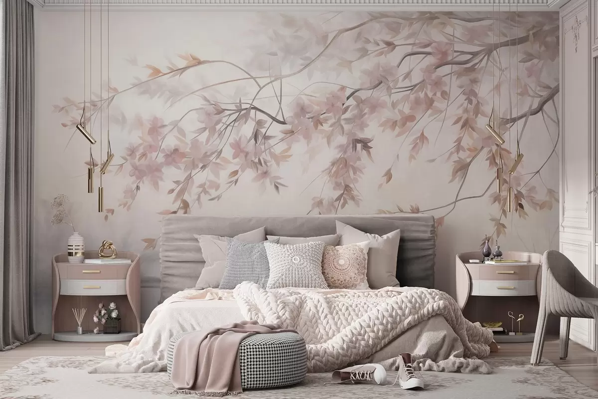 Fototapetak Texturált táj cseresznyevirág ágakkal, rózsaszín levelekkel, lágy, ködös háttérrel Nr. w09743