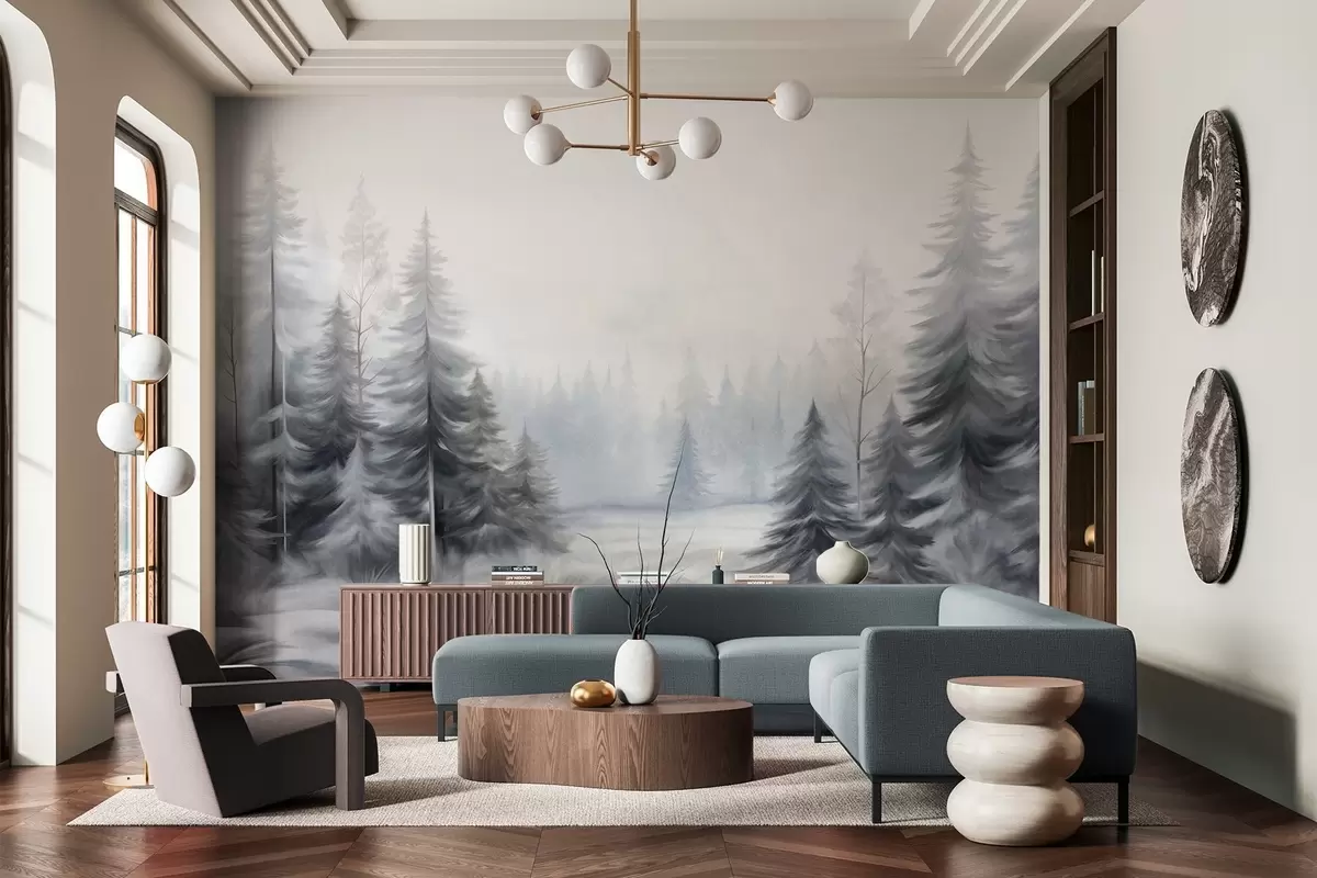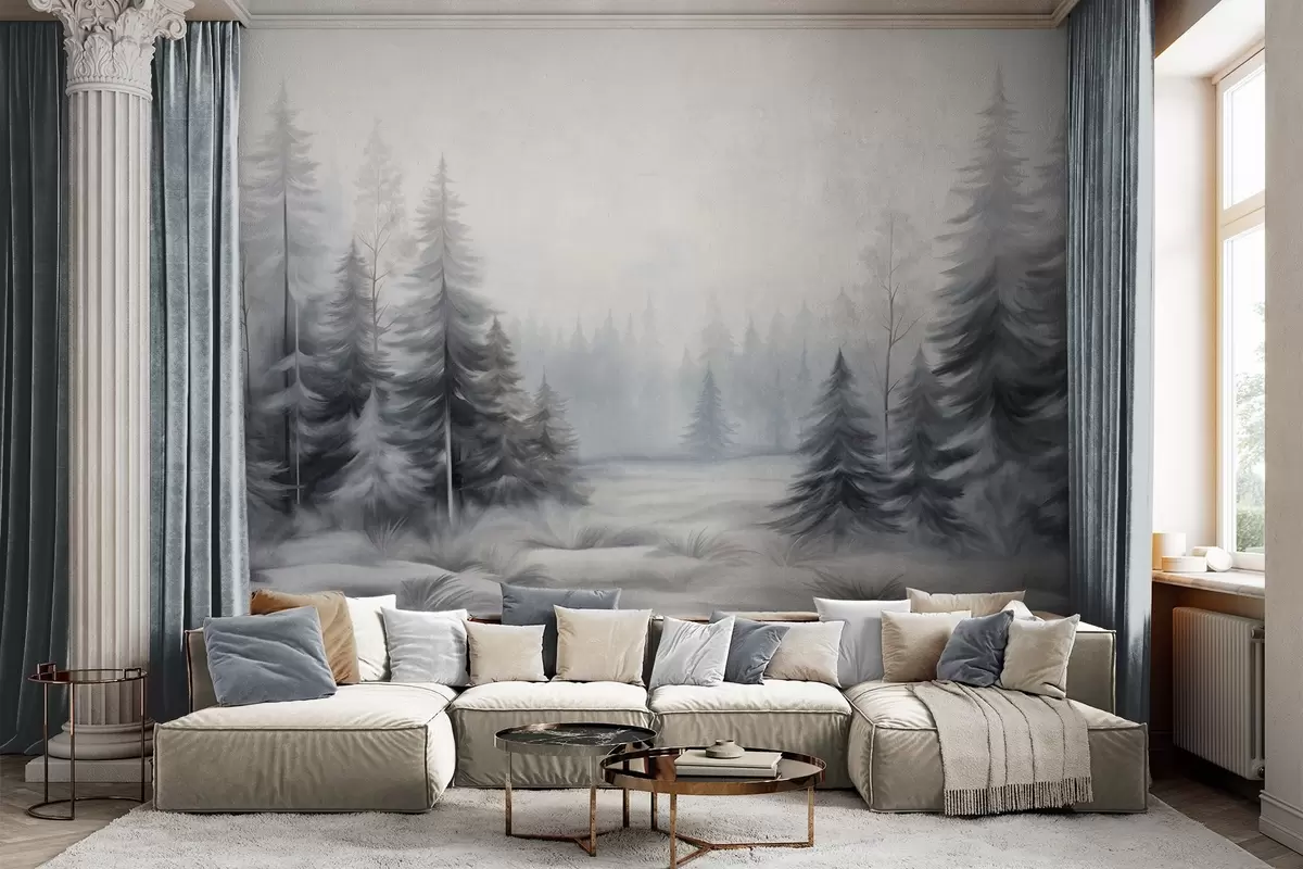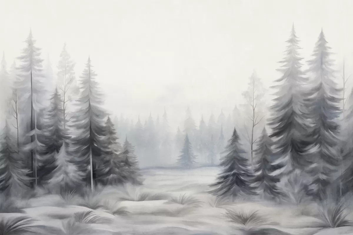 Fototapetak Texturált téli erdő fái ködben, tompa szürke és fehér tónusokban Nr. w09745