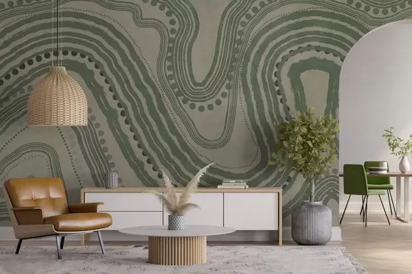 Fototapetak Absztrakt zöld és bézs hullámvonalak és pontok, modern texturált művészet Nr. w09747