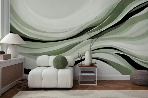 Fototapetak Absztrakt hullámvonalak zöld és fekete árnyalatokban világos háttér előtt, texturált művészet Nr. w09748v1