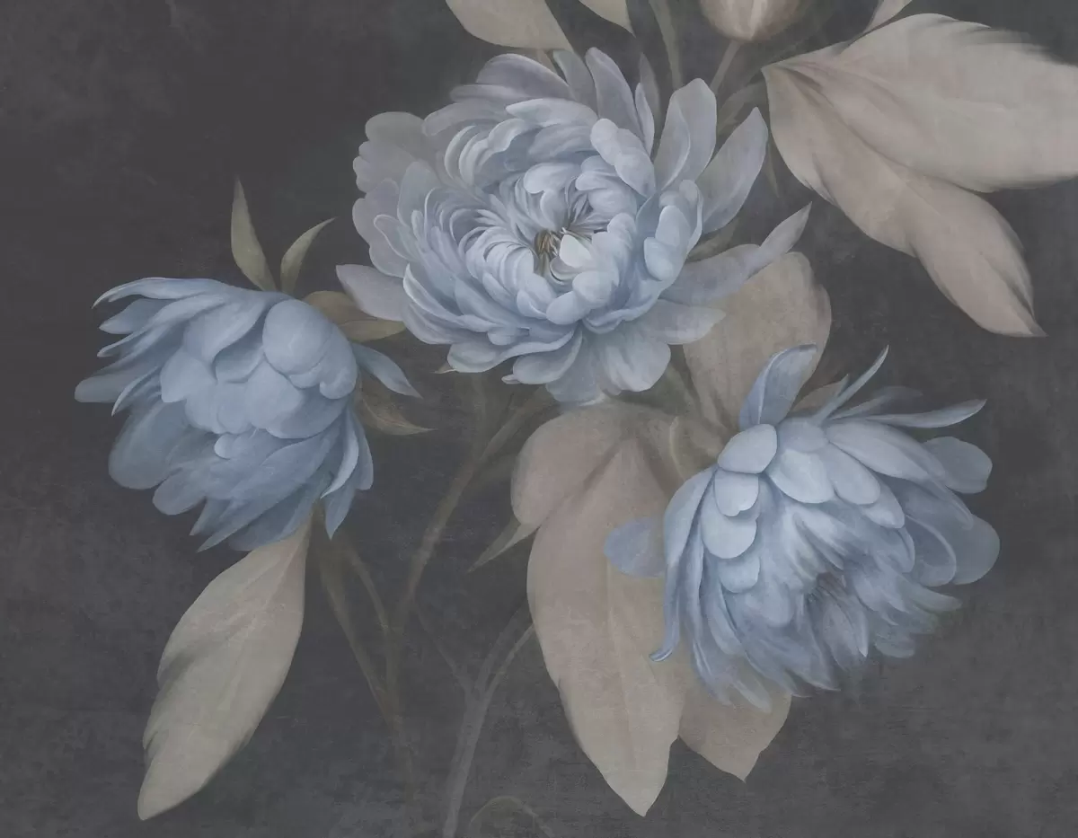 Fototapetak Sötét háttér előtt texturált világoskék pünkösdi rózsa virágok bézs színű levelekkel Nr. w09751