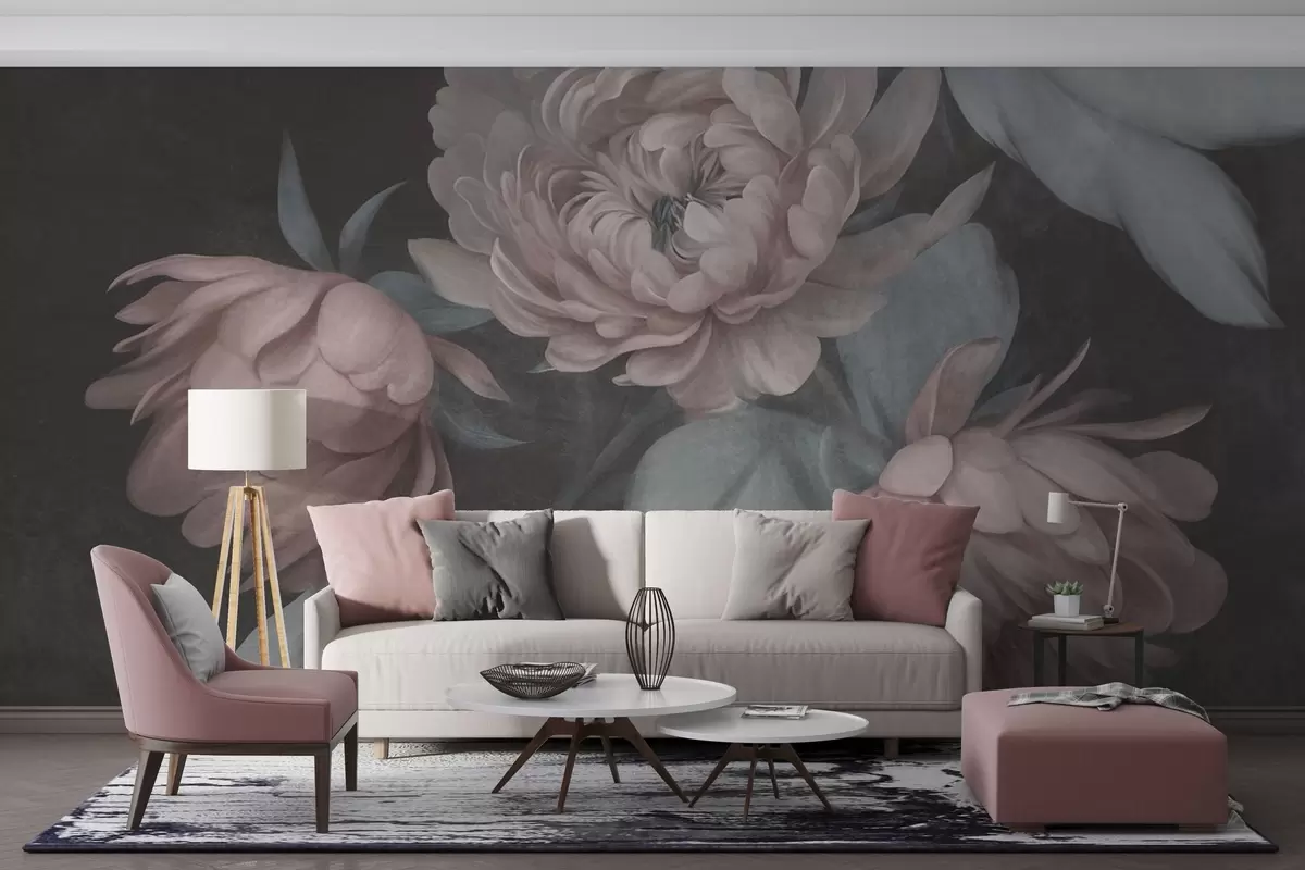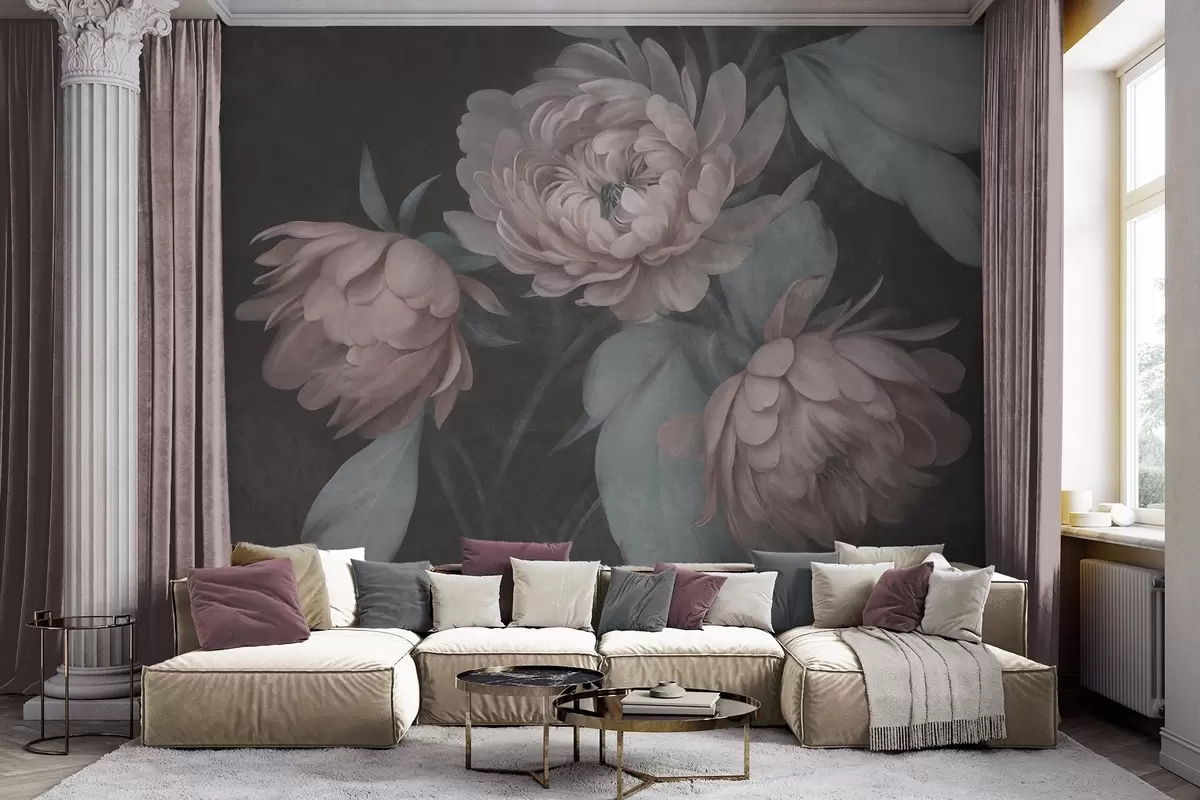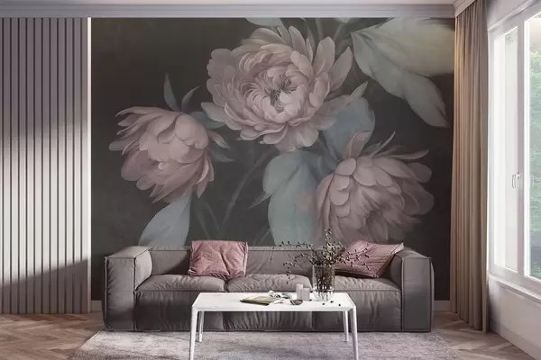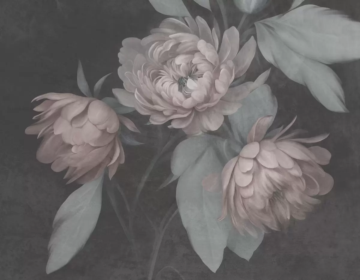 Fototapetak Sötét háttér előtt texturált, halványrózsaszín pünkösdi rózsa virágok és tompa zöld levelek Nr. w09751v1