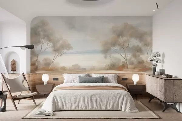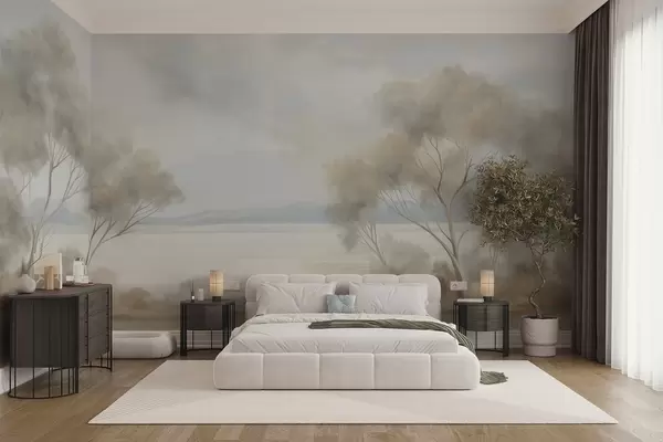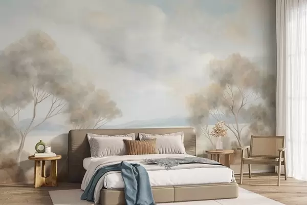Fototapetak Tájkép textúrájú festészeti stílus, fákkal a felhős ég alatt Nr. w09753