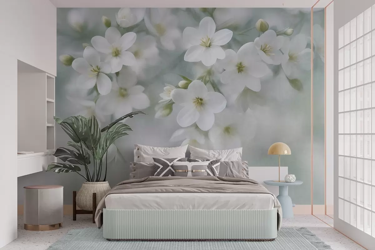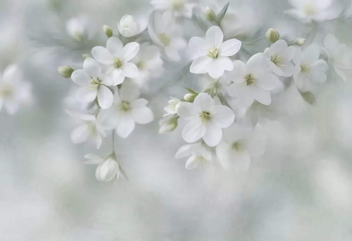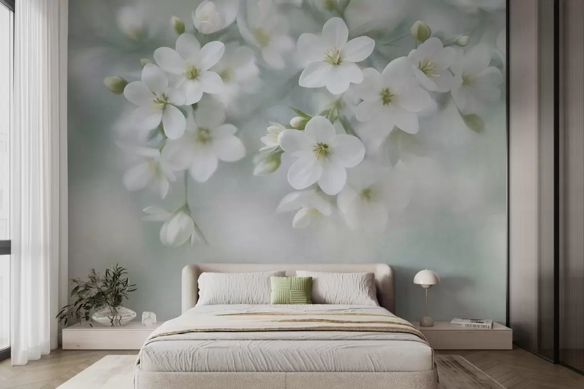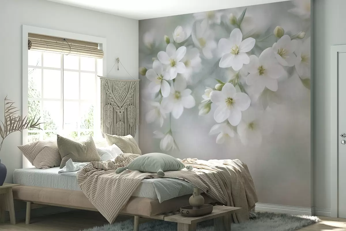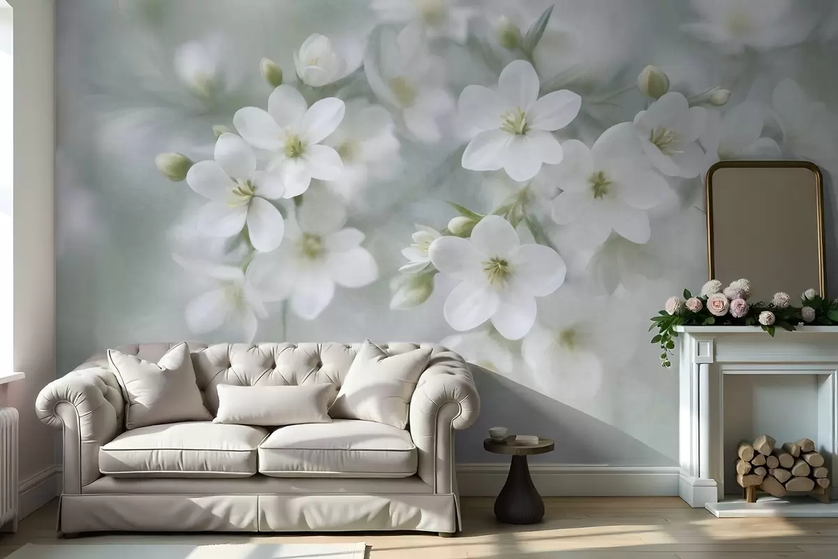 Fototapetak Finom textúrájú fehér virágok, amelyek a háttérben lágyan elmosódnak Nr. w09759