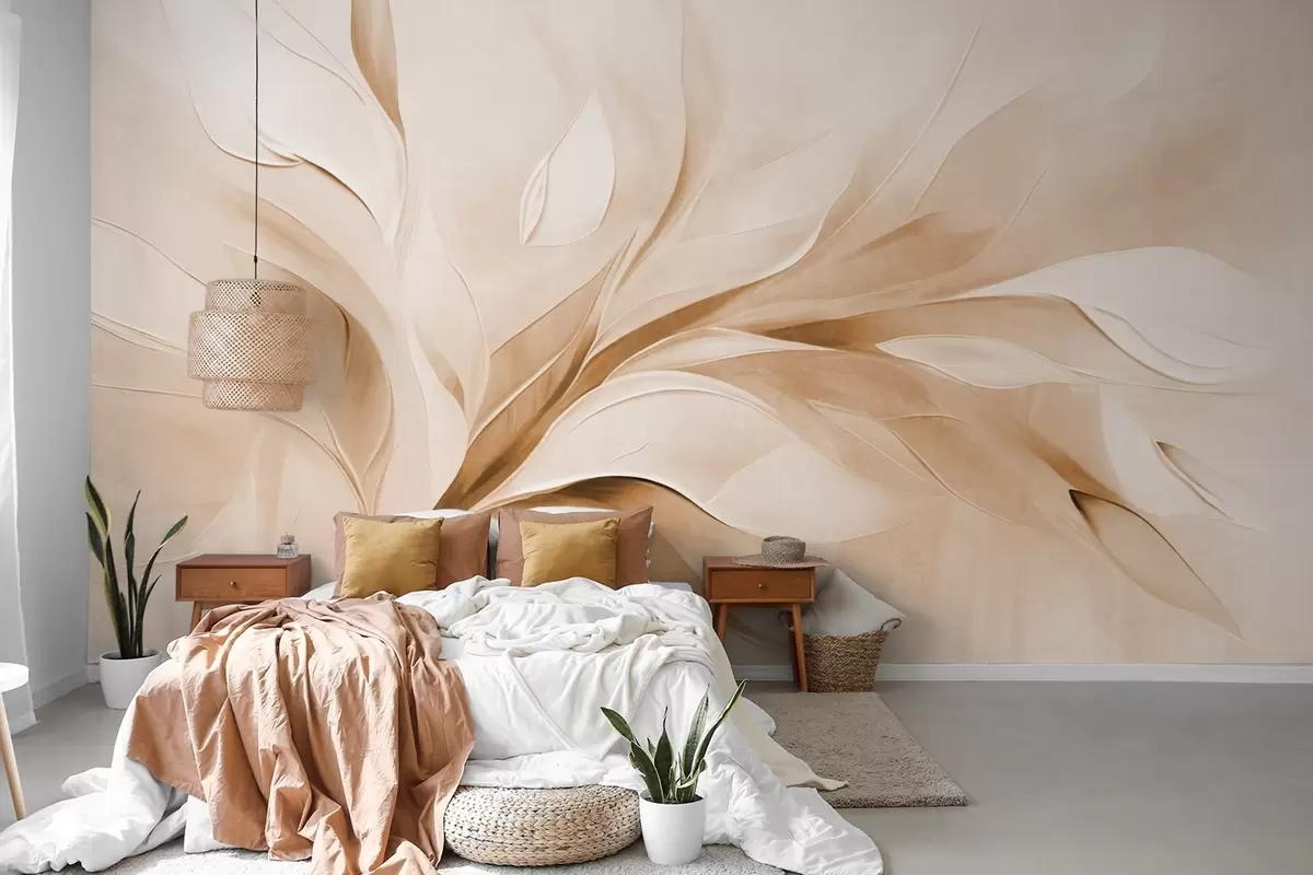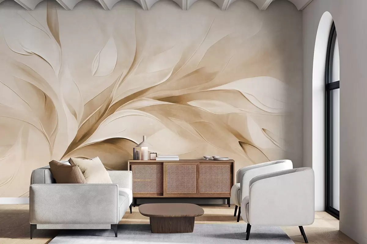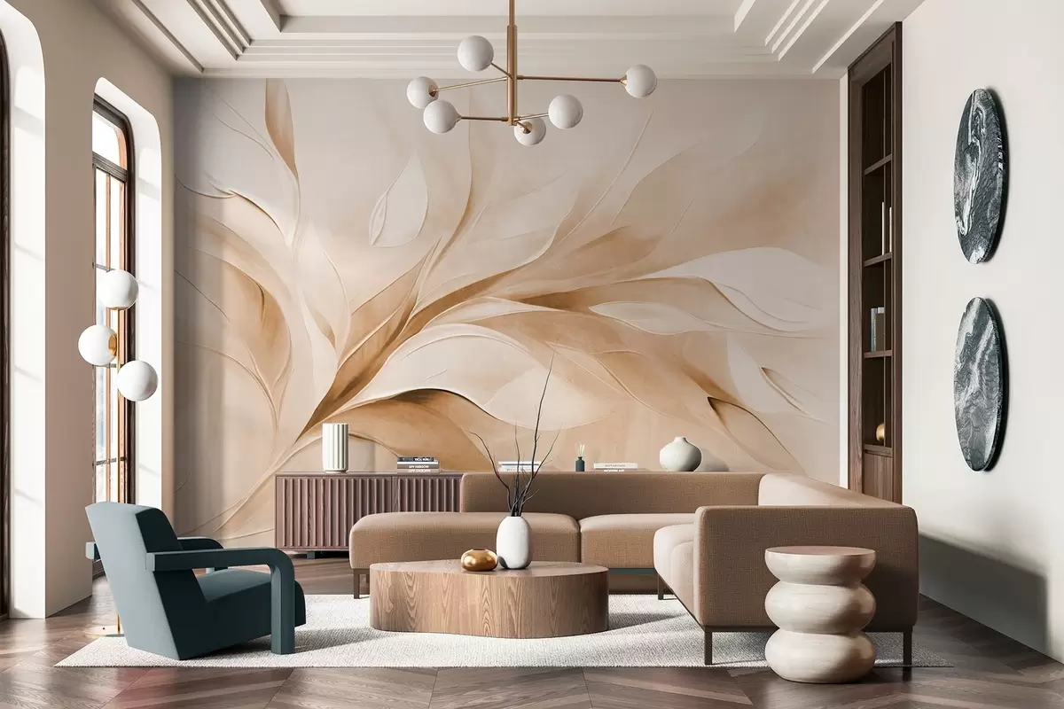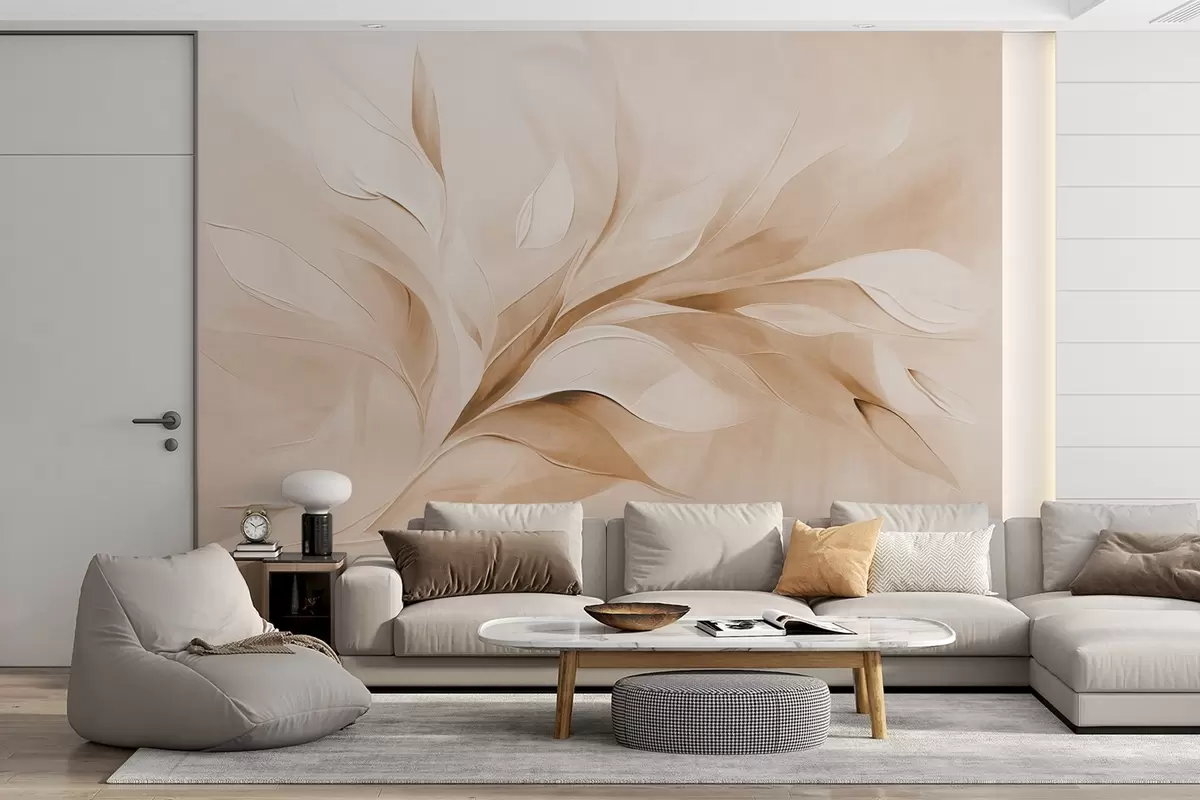 Fototapetak Absztrakt textúrájú festészeti stílus, bézs és fehér színű, lebegő levelekkel Nr. w09765v1