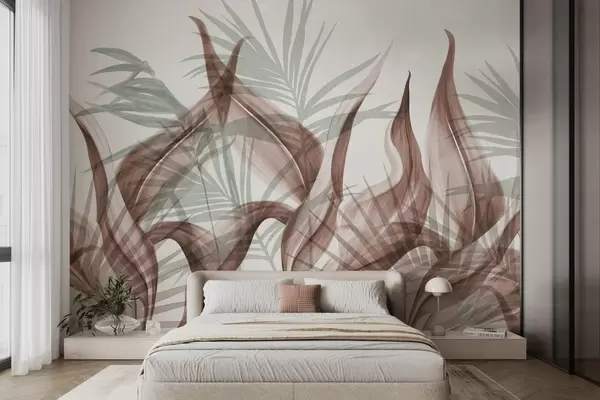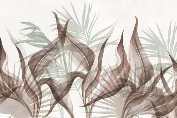 Fototapetak Barna és zöld árnyalatú trópusi levelek fehér háttér előtt, texturált akvarell stílusban Nr. w09772