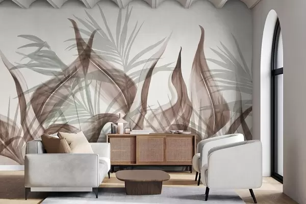Fototapetak Barna és zöld árnyalatú trópusi levelek fehér háttér előtt, texturált akvarell stílusban Nr. w09772