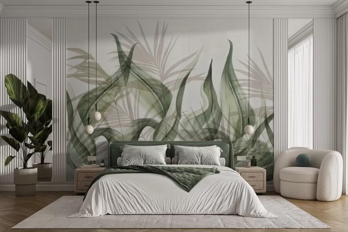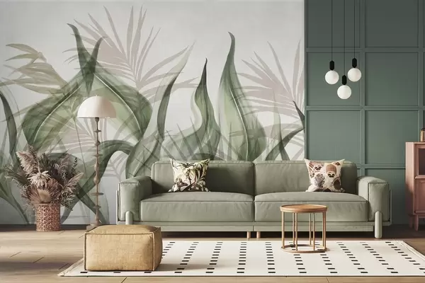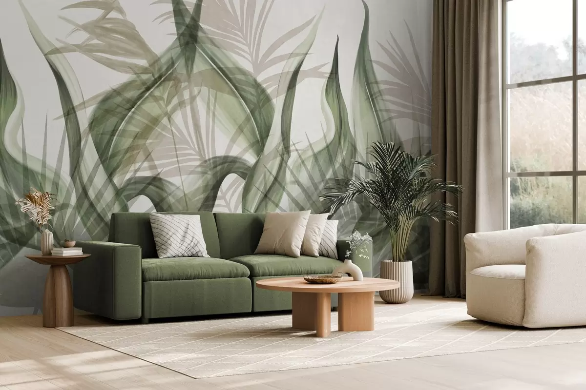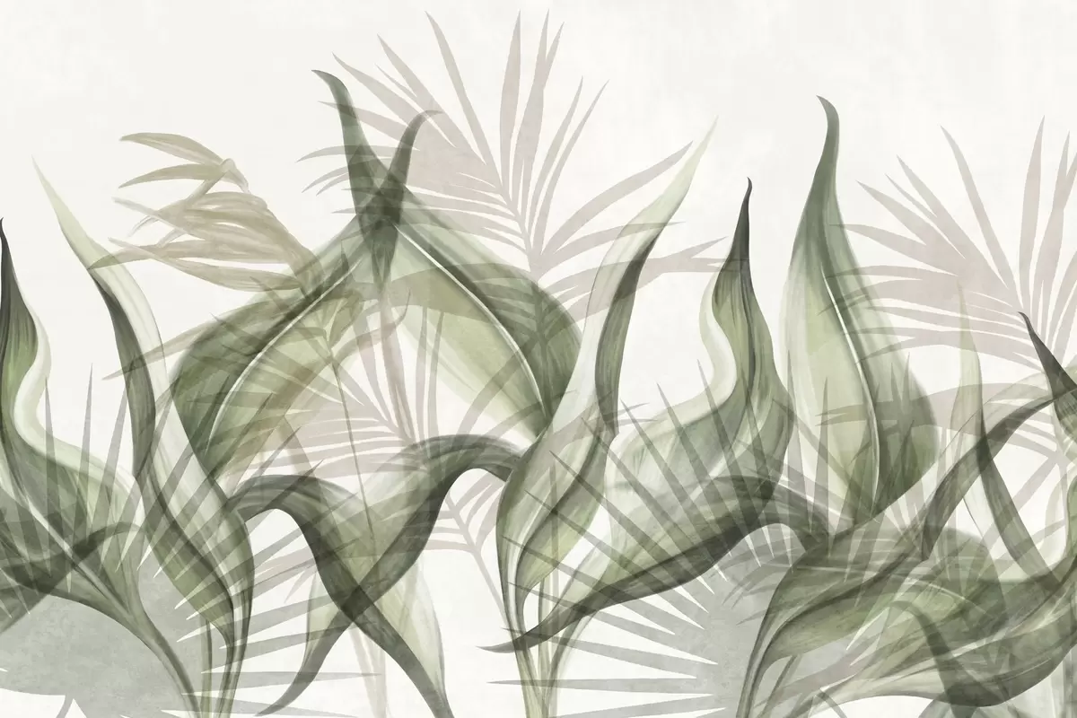 Fototapetak Trópusi levelek bézs és zöld árnyalatokban fehér háttér előtt, texturált akvarell stílusban Nr. w09772v1