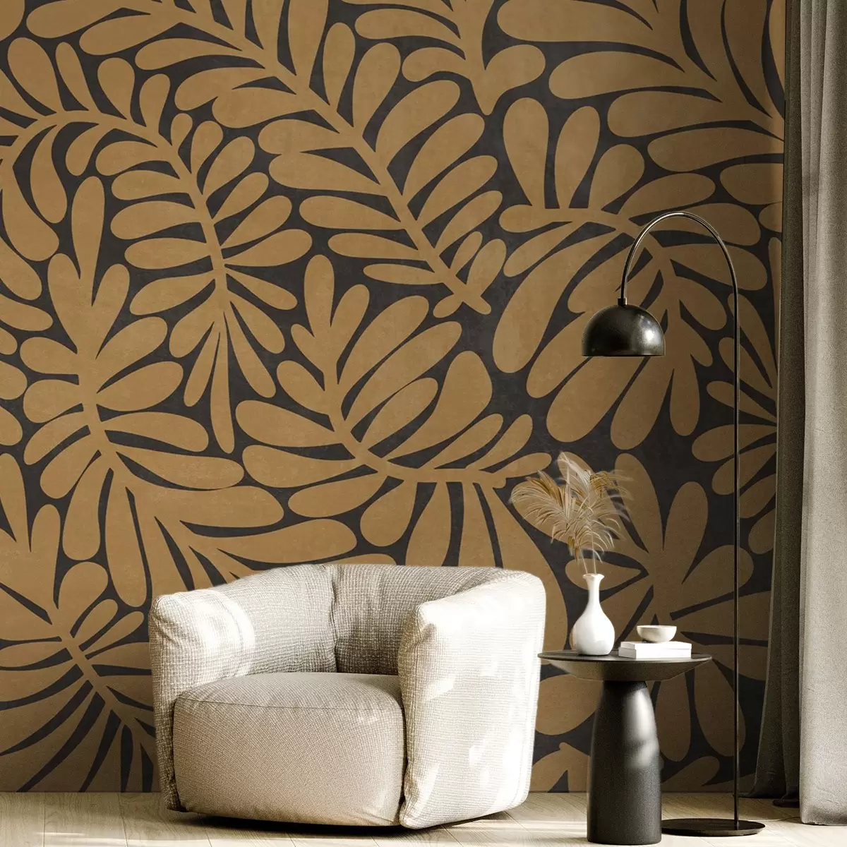 Fototapetak Stilizált mustársárga levelek sötét szürke háttér előtt, texturált grafika Nr. w09775