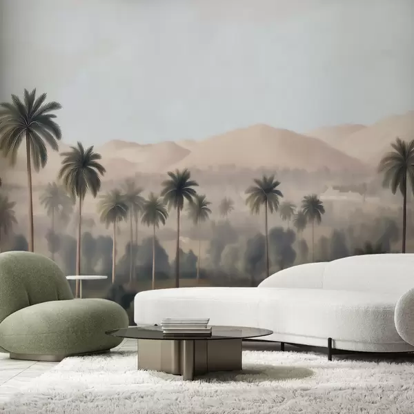 Fototapetak Trópusi táj pálmafákkal és hegyekkel, retro panoráma bézs és zöld árnyalatokban Nr. w09798