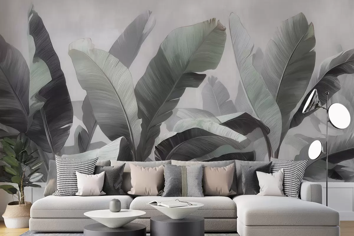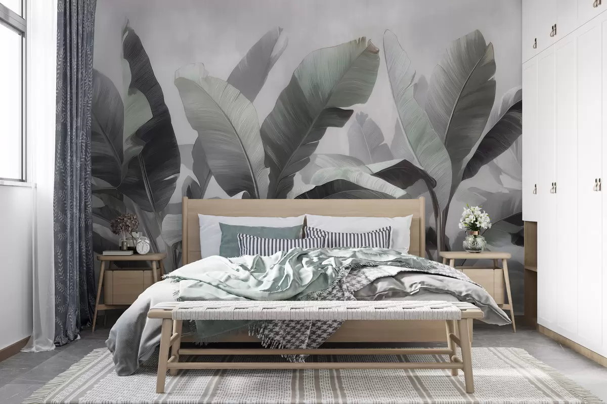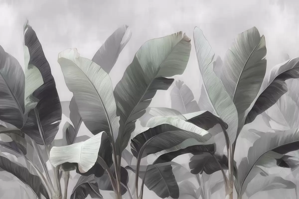 Fototapetak Absztrakt, trópusi, nagy banánlevelek semleges színvilágban, lágy szürke-zöld árnyalatokkal Nr. w09805