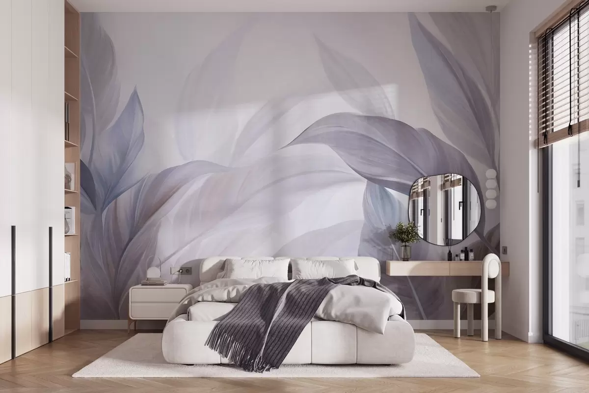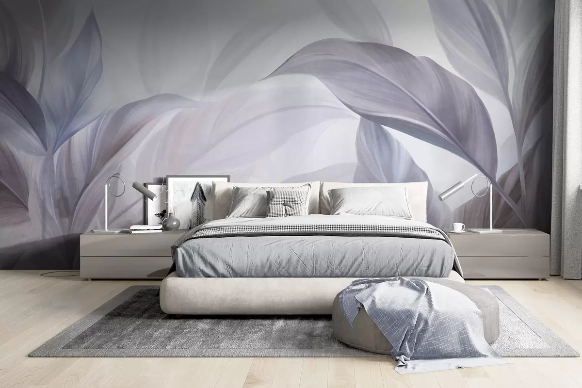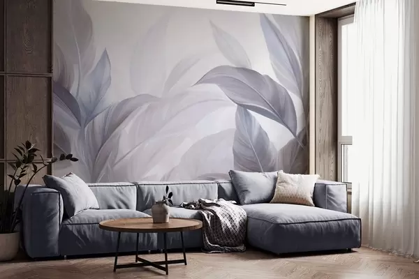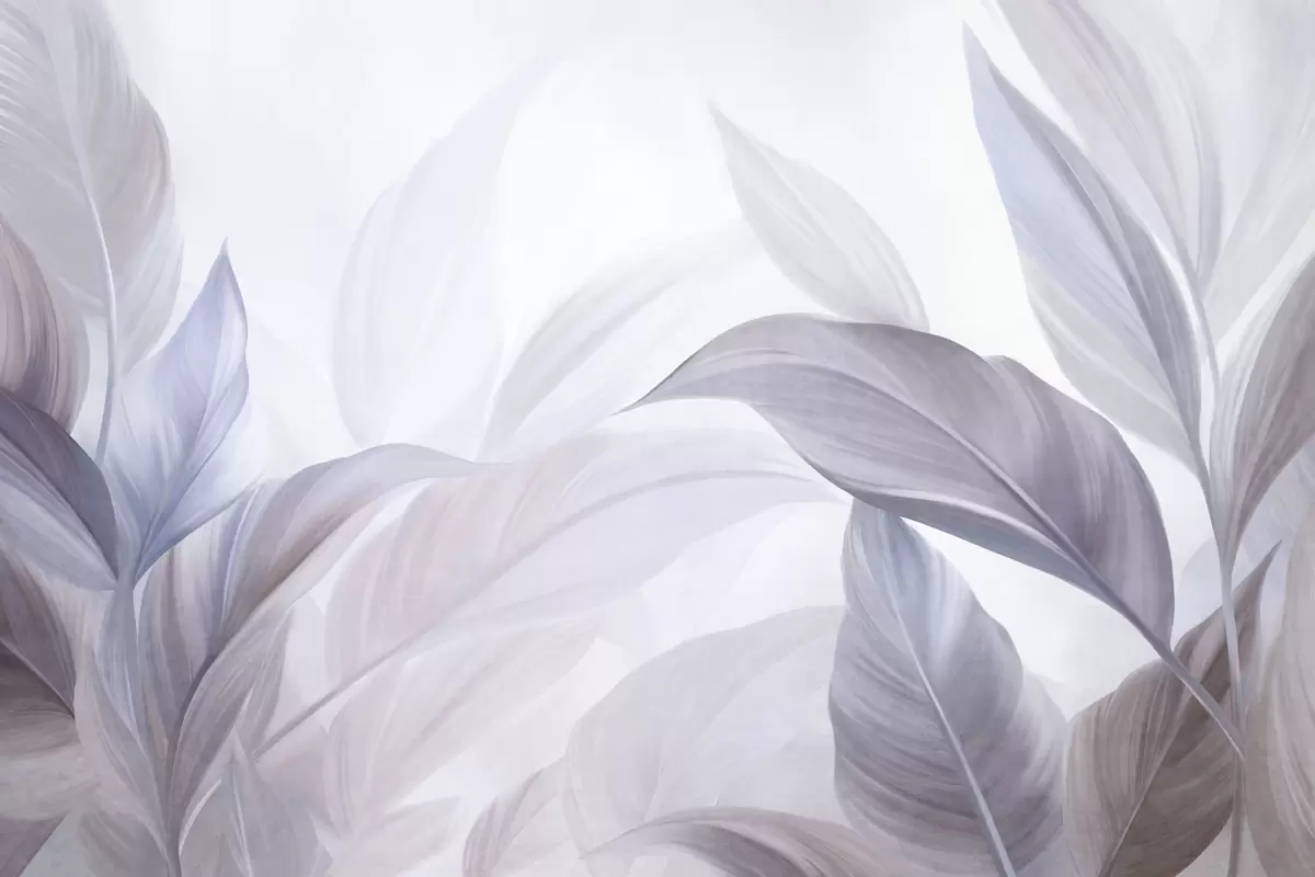 Fototapetak Nagy, halványkék és lila trópusi levelek, lágy, pasztell színekkel, texturált mintázattal Nr. w09816v1