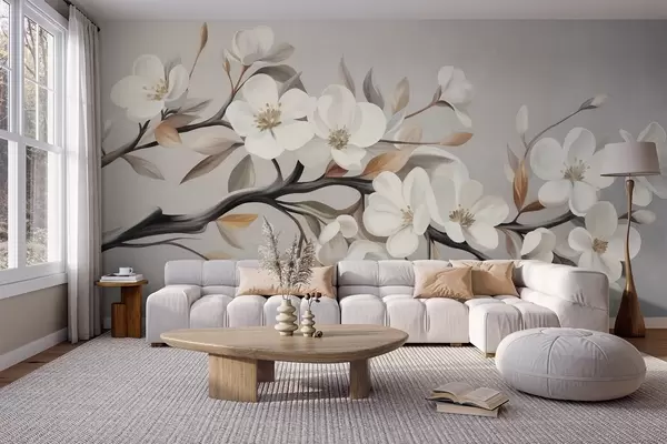 Fototapetak Texturált ág fehér virágokkal és barna levelekkel világosszürke háttér előtt Nr. w09817