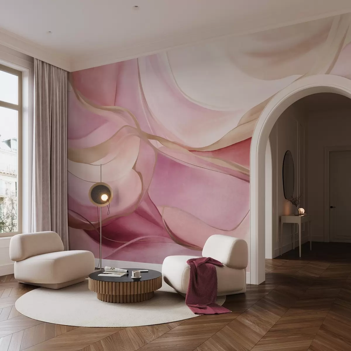 Fototapetak Absztrakt, texturált, áramló formák rózsaszín és bézs árnyalatokban, finom sárga vonalakkal Nr. w09818