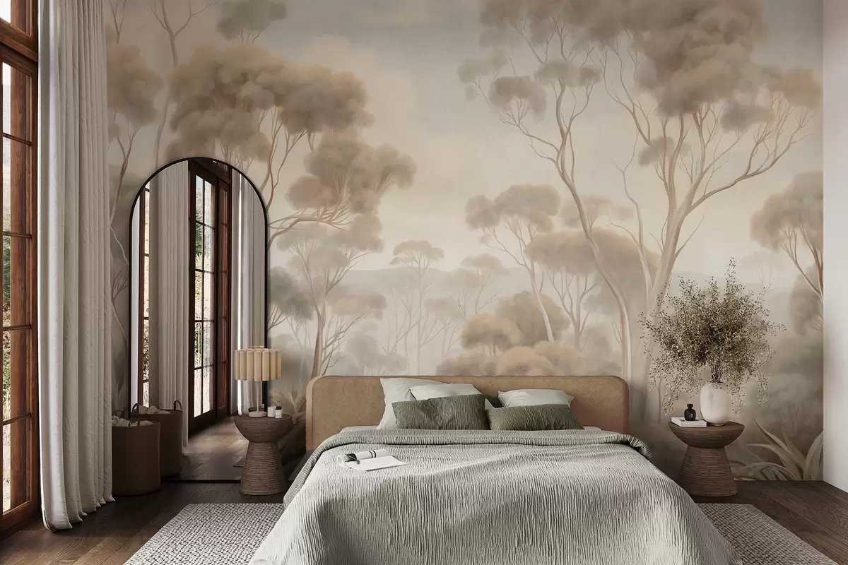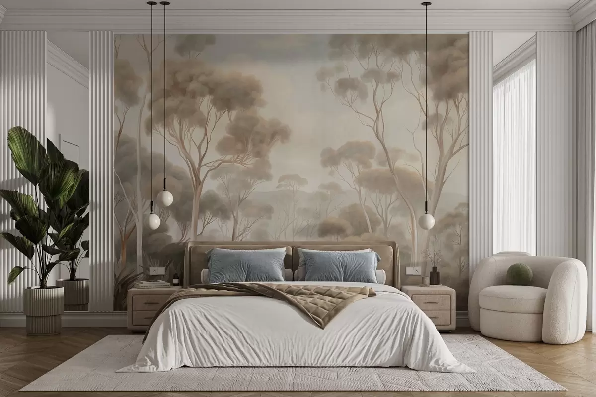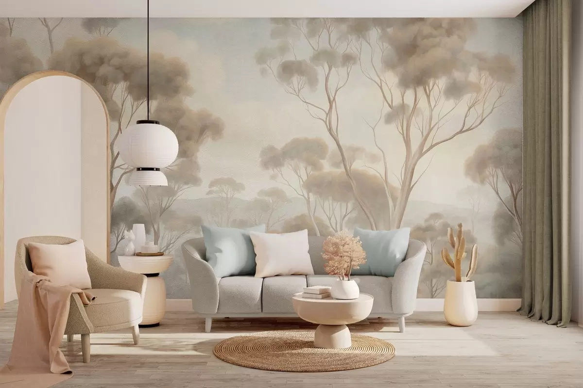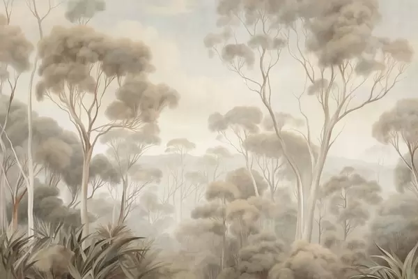 Fototapetak Ködös erdei táj magas eukaliptuszfákkal, dombos hegyekkel és felhős égbolttal, texturált grafika Nr. w09822