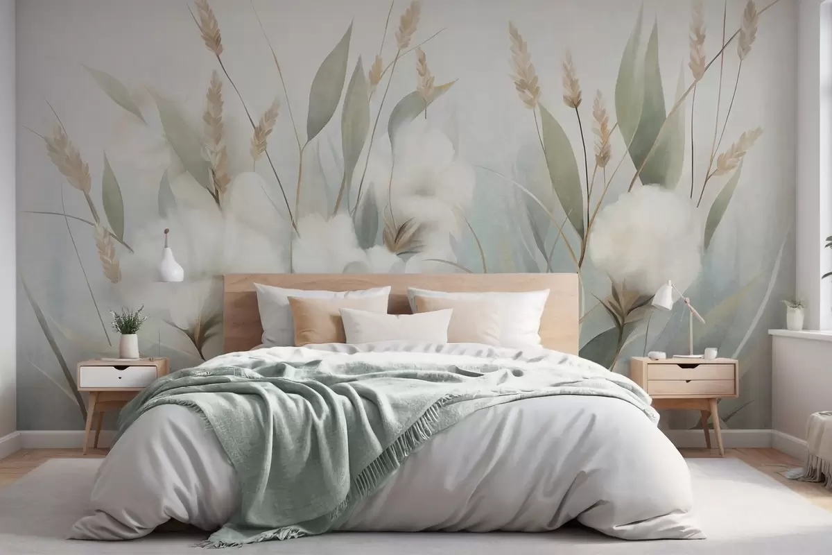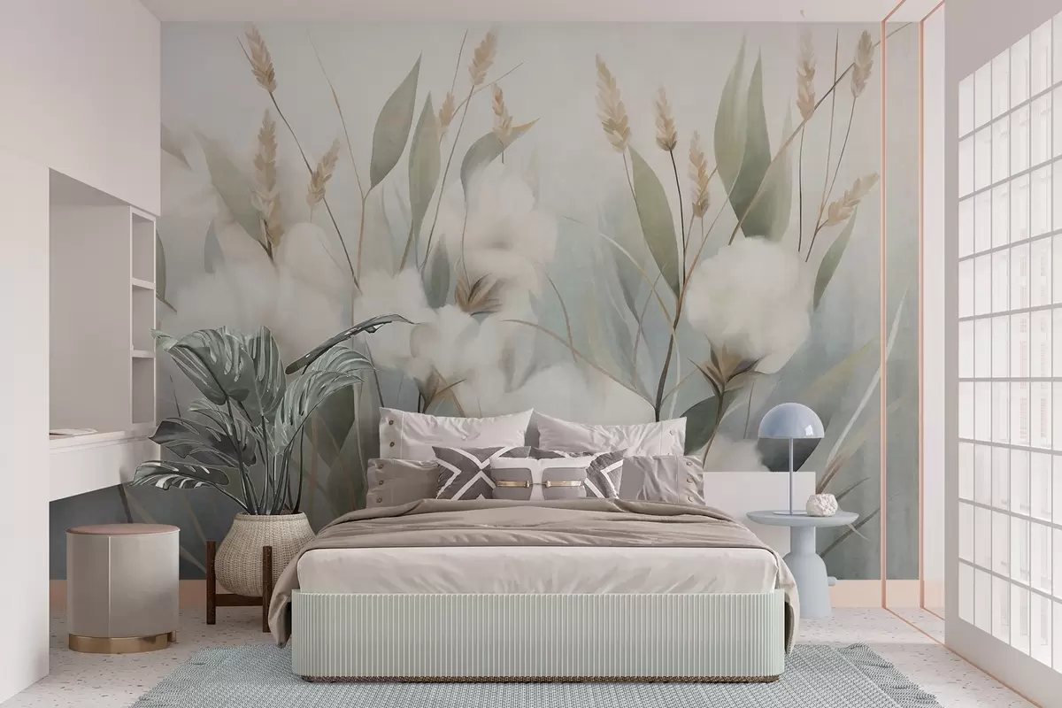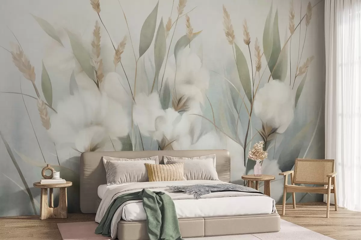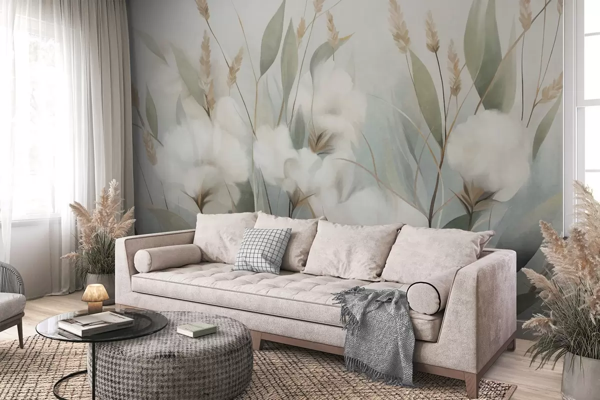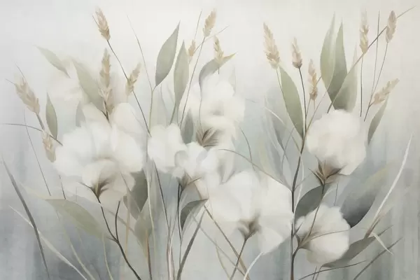 Fototapetak Fehér szárított virágok és magas fű, lágy, visszafogott háttérrel, festett, impresszionista stílusban Nr. w09823