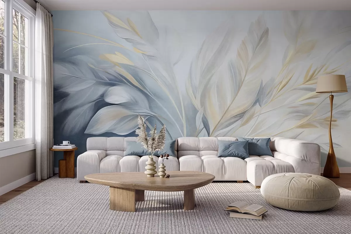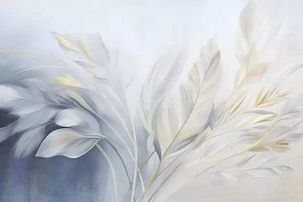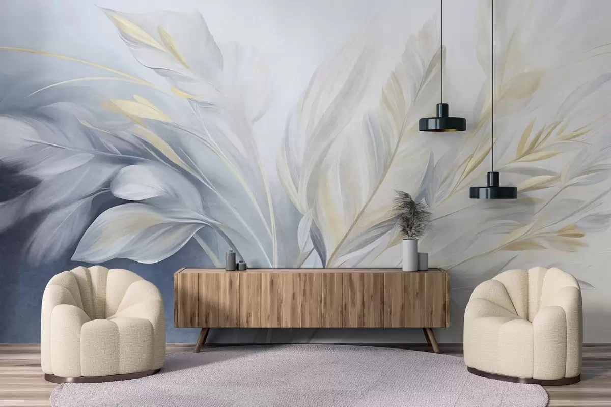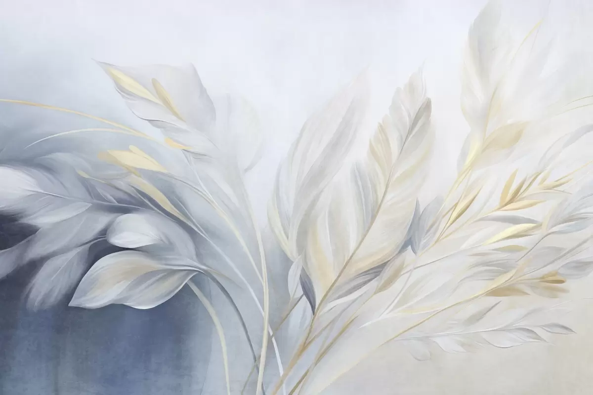 Fototapetak Texturált tollak sárga díszítéssel, halványkék és fehér háttér előtt Nr. w09826