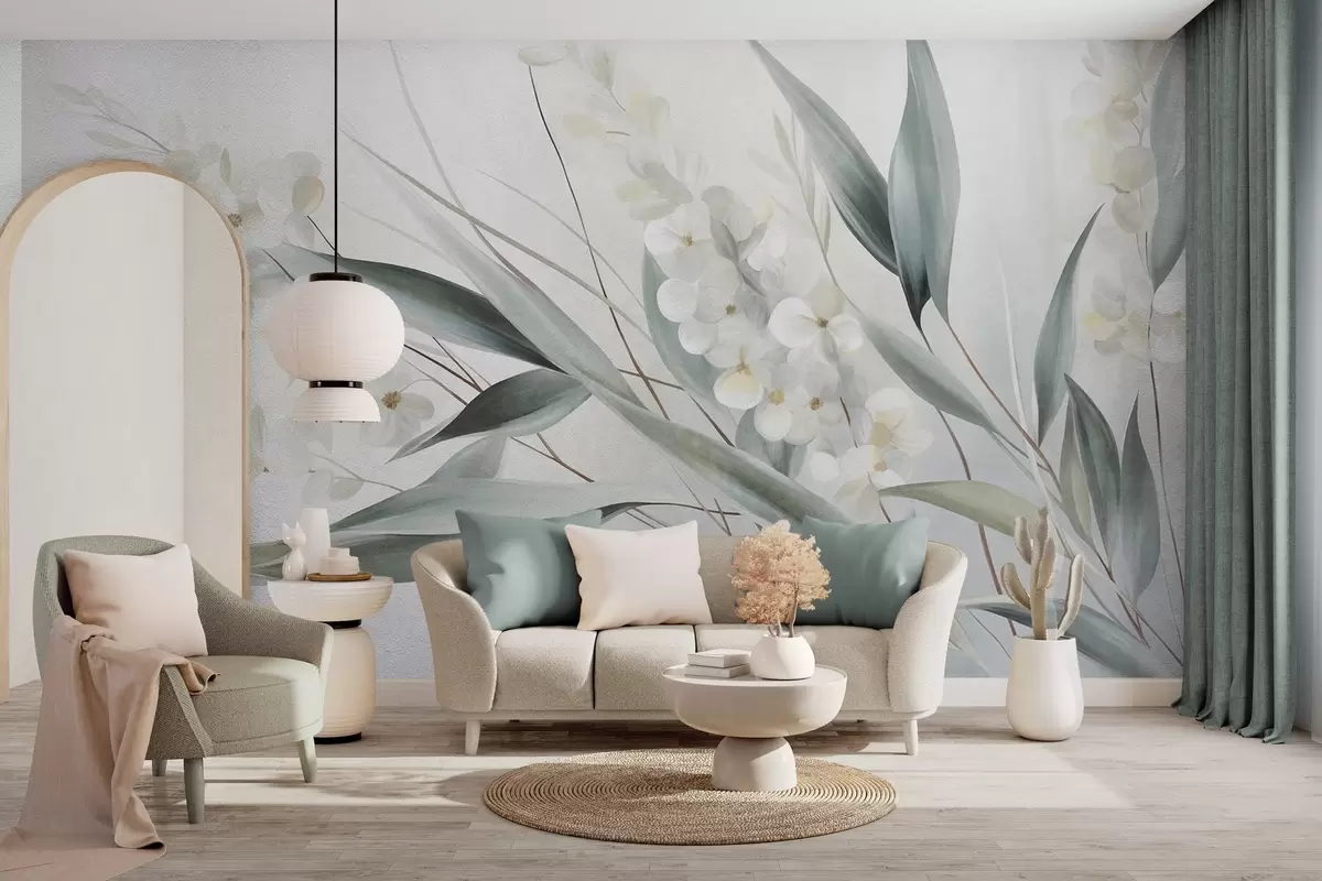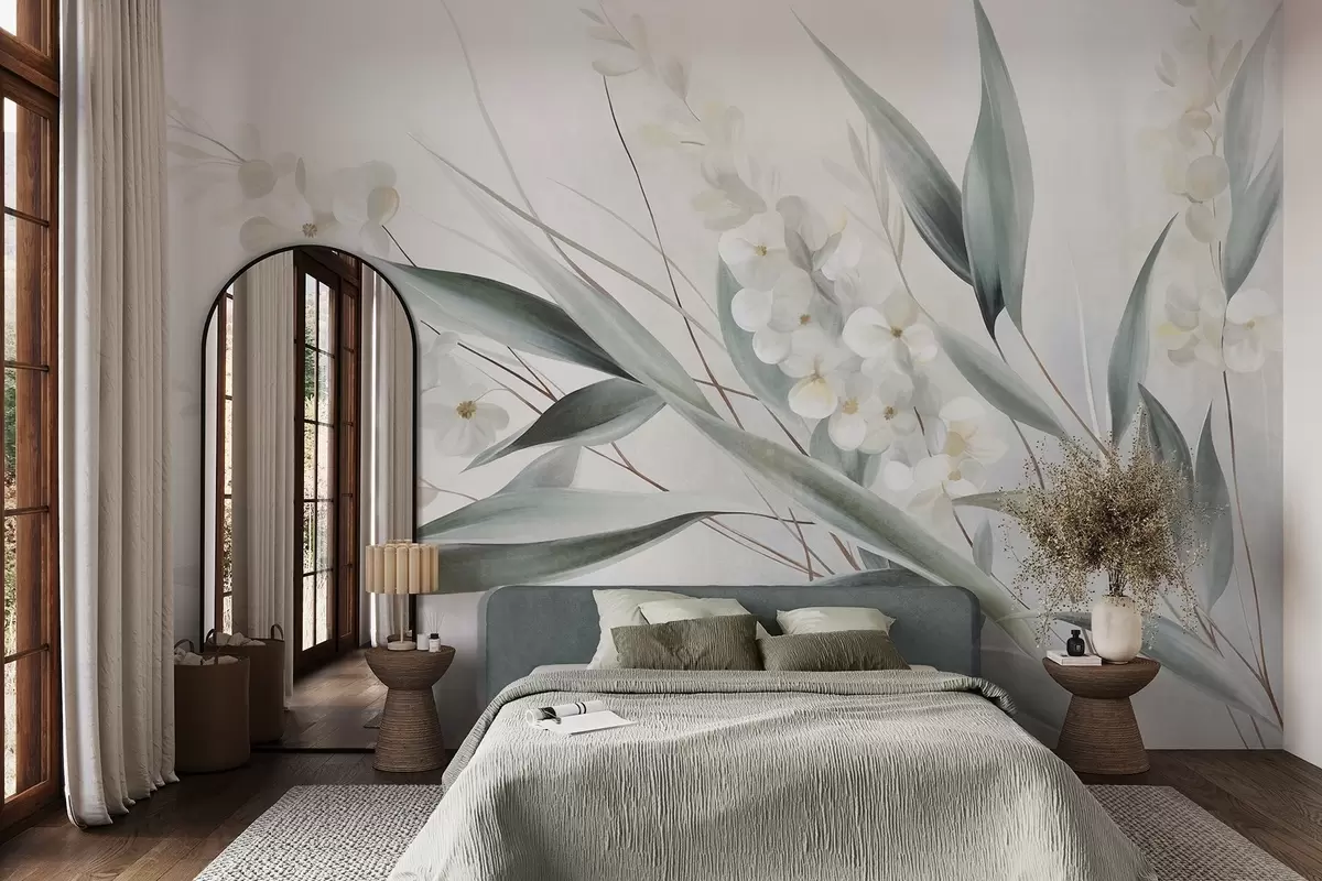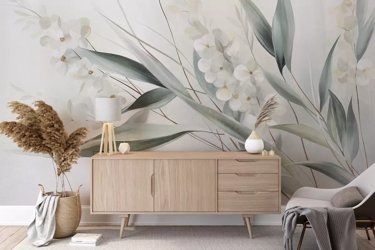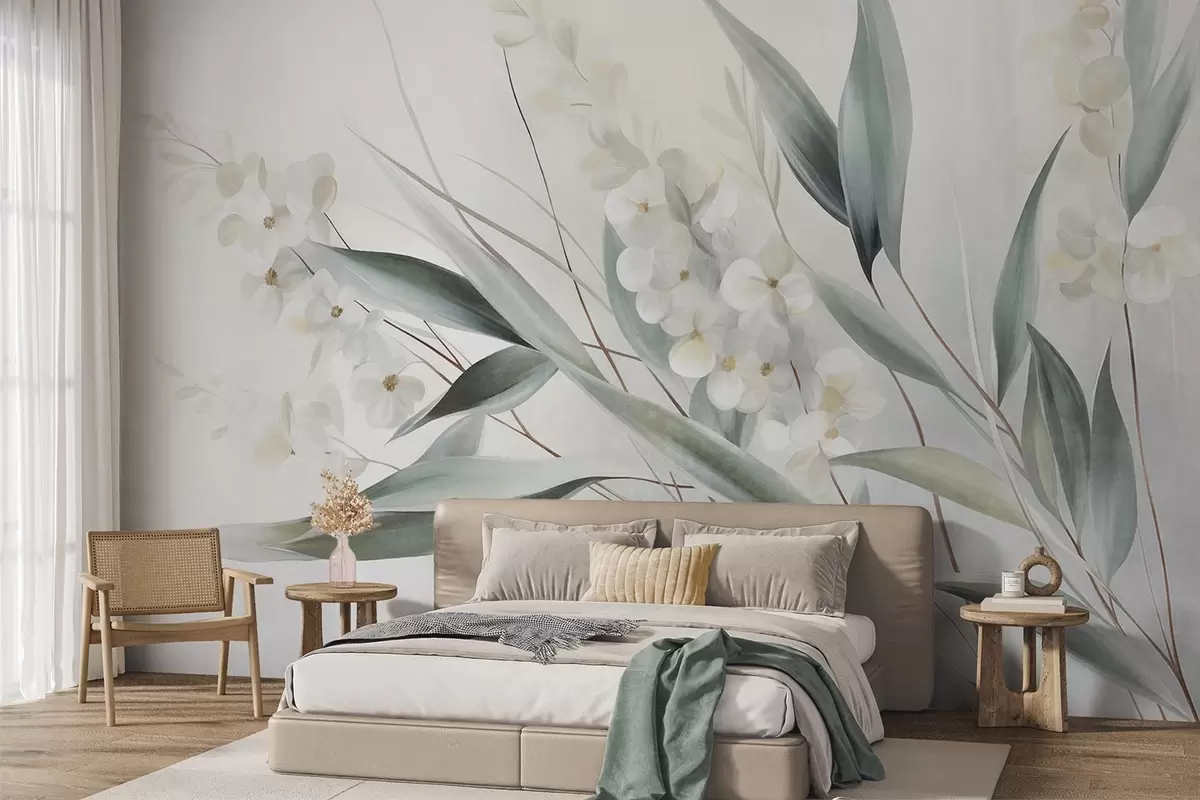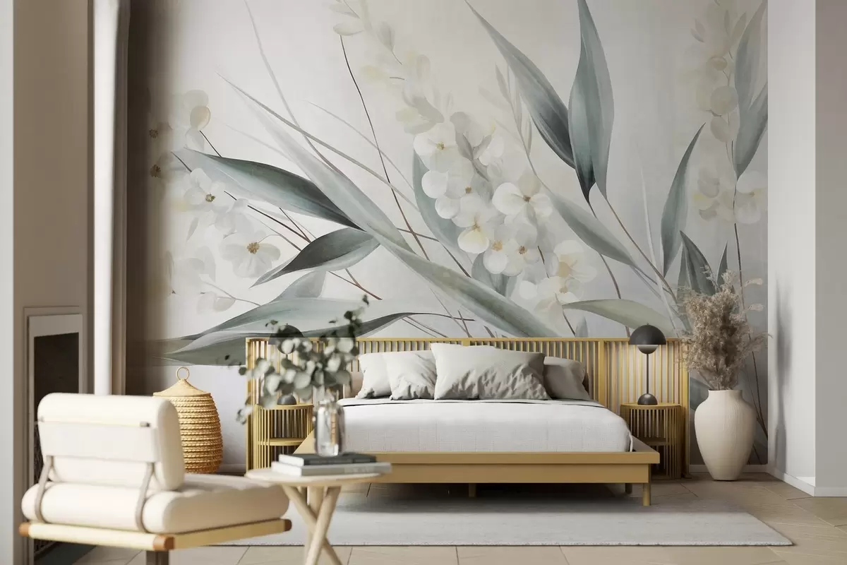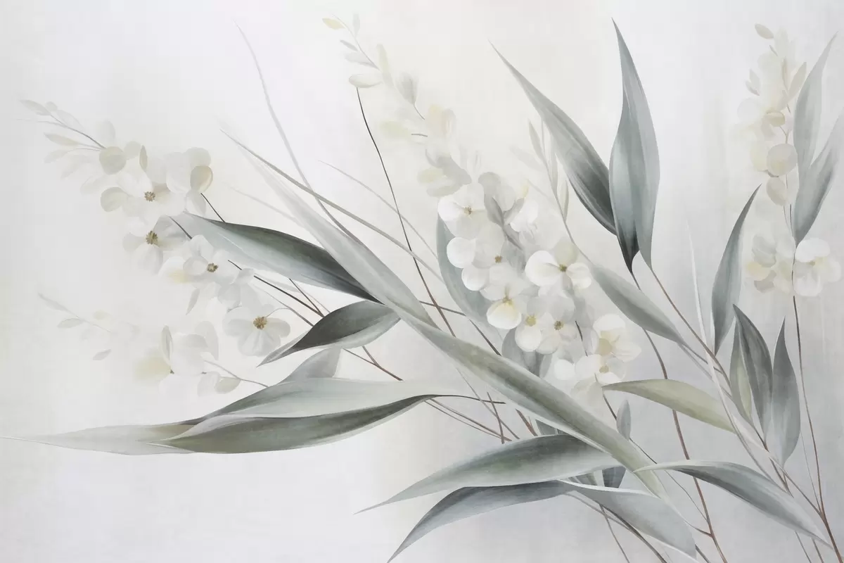 Fototapetak Finom virágok és hosszú zöld levelek festői stílusban, finom ecsetvonásokkal, texturált alkotás Nr. w09827