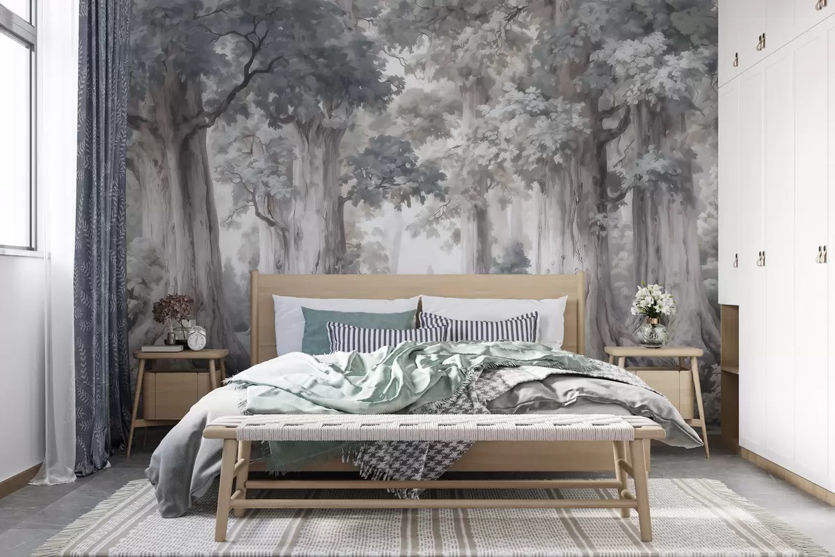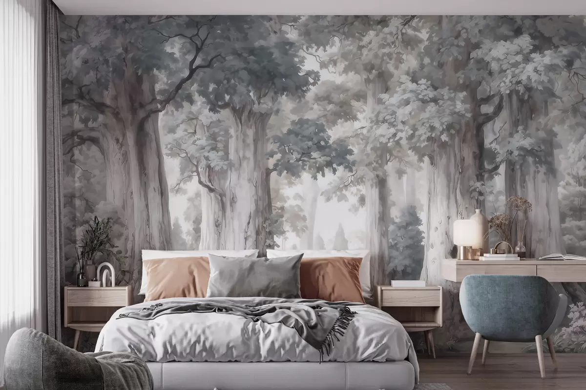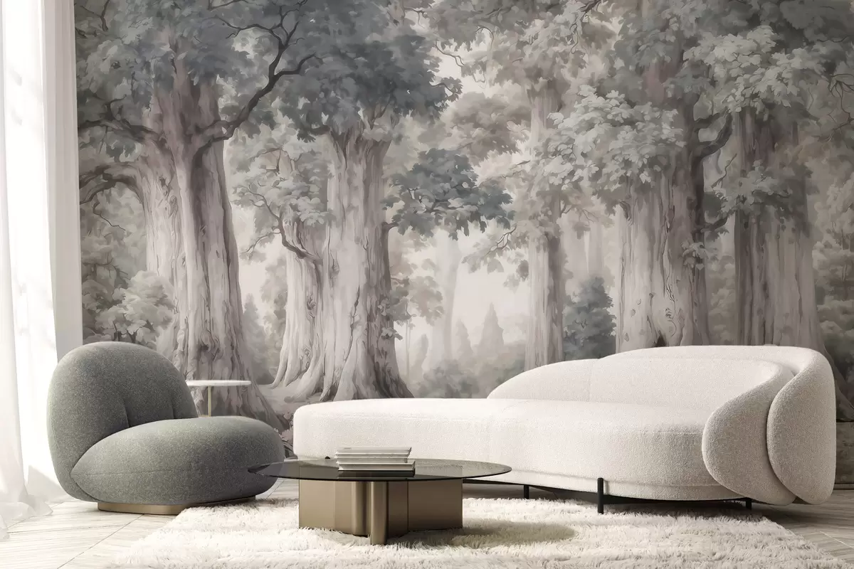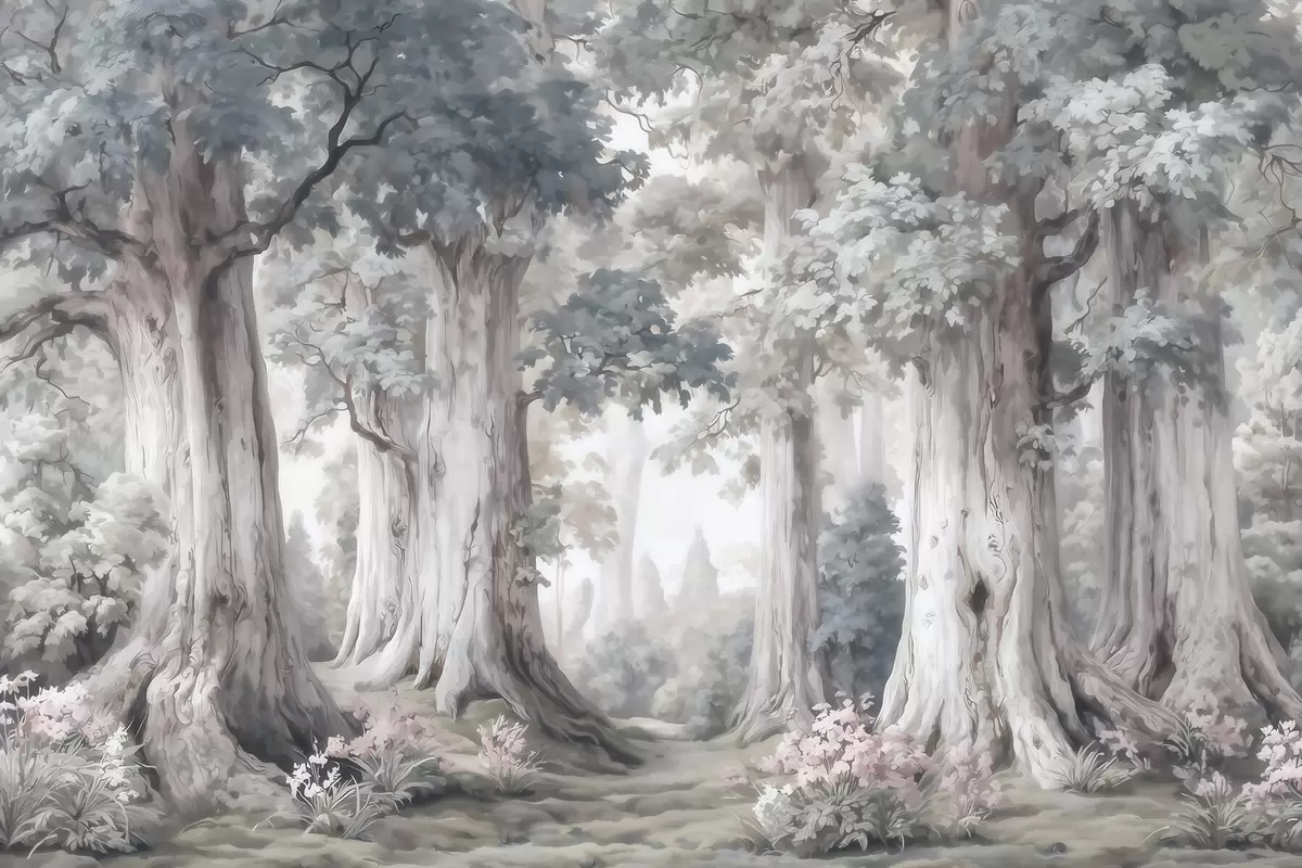 Fototapetak Egy mesebeli erdő magas fákkal és akvarellszerű, lágy, visszafogott színvilággal Nr. w09849