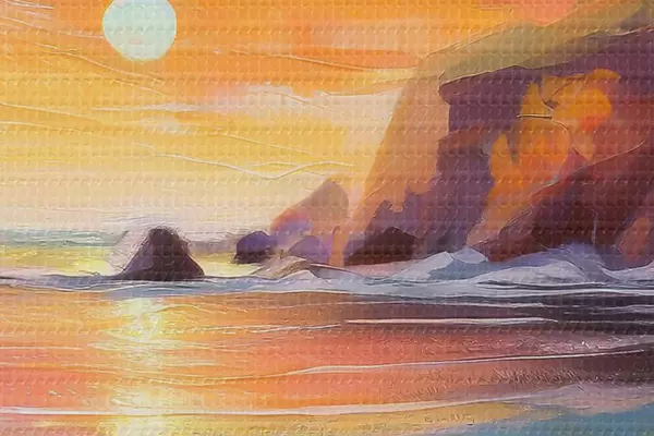Kép Napfelkelte a tengerparton, tengeri hullámok, élénk ecsetvonások, akril Nr r36581