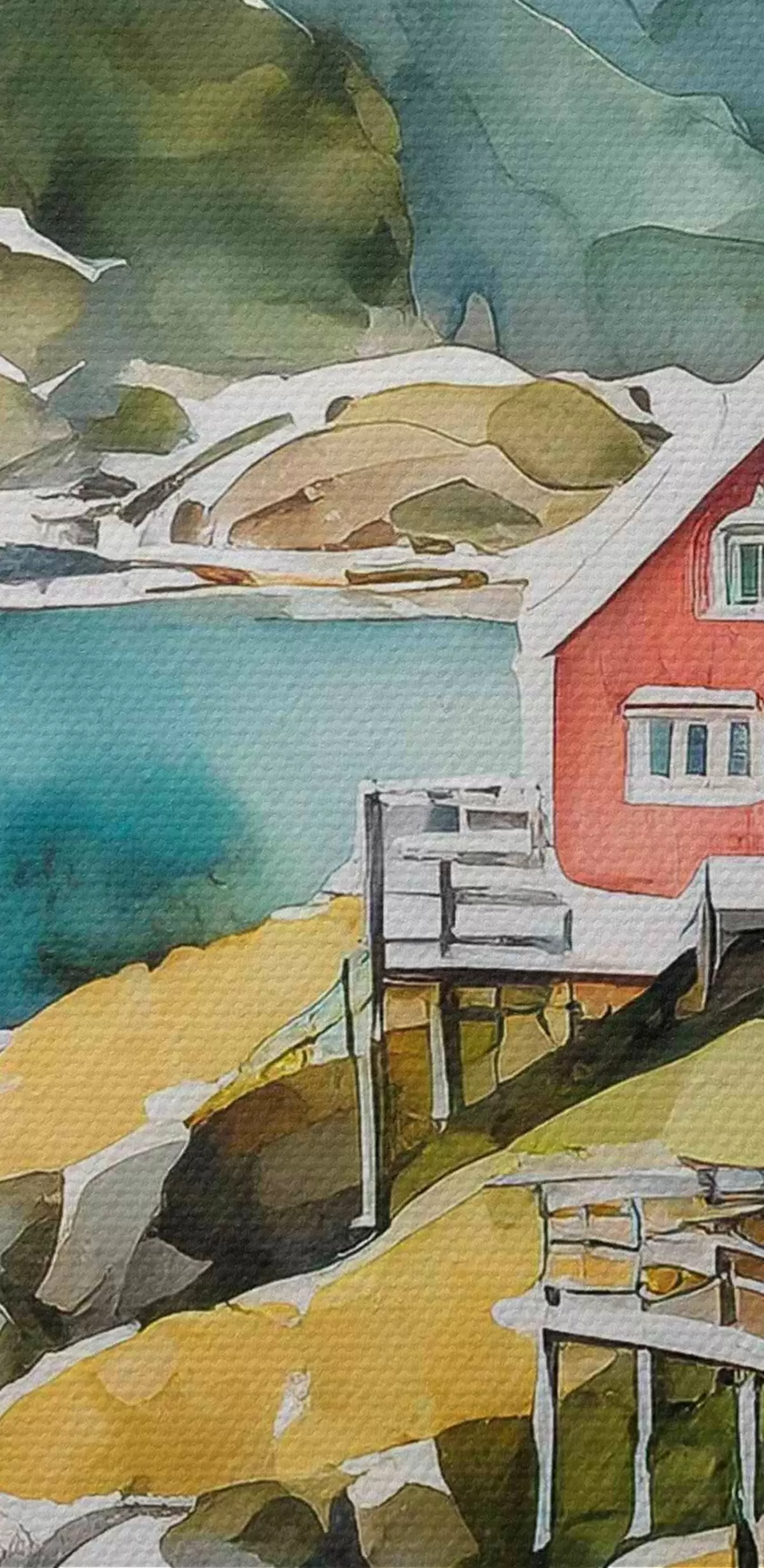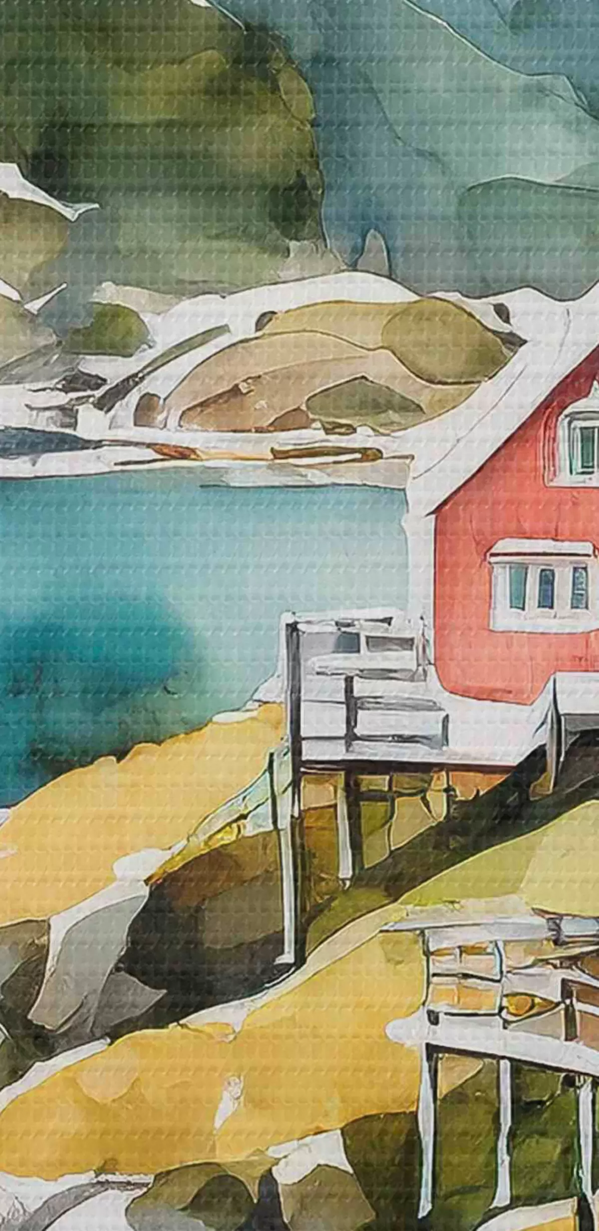 Kép Akvarell házak egy dombon egy víztározó mellett Nr r36678