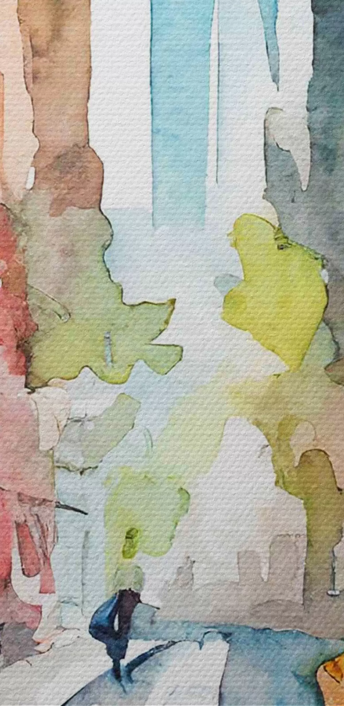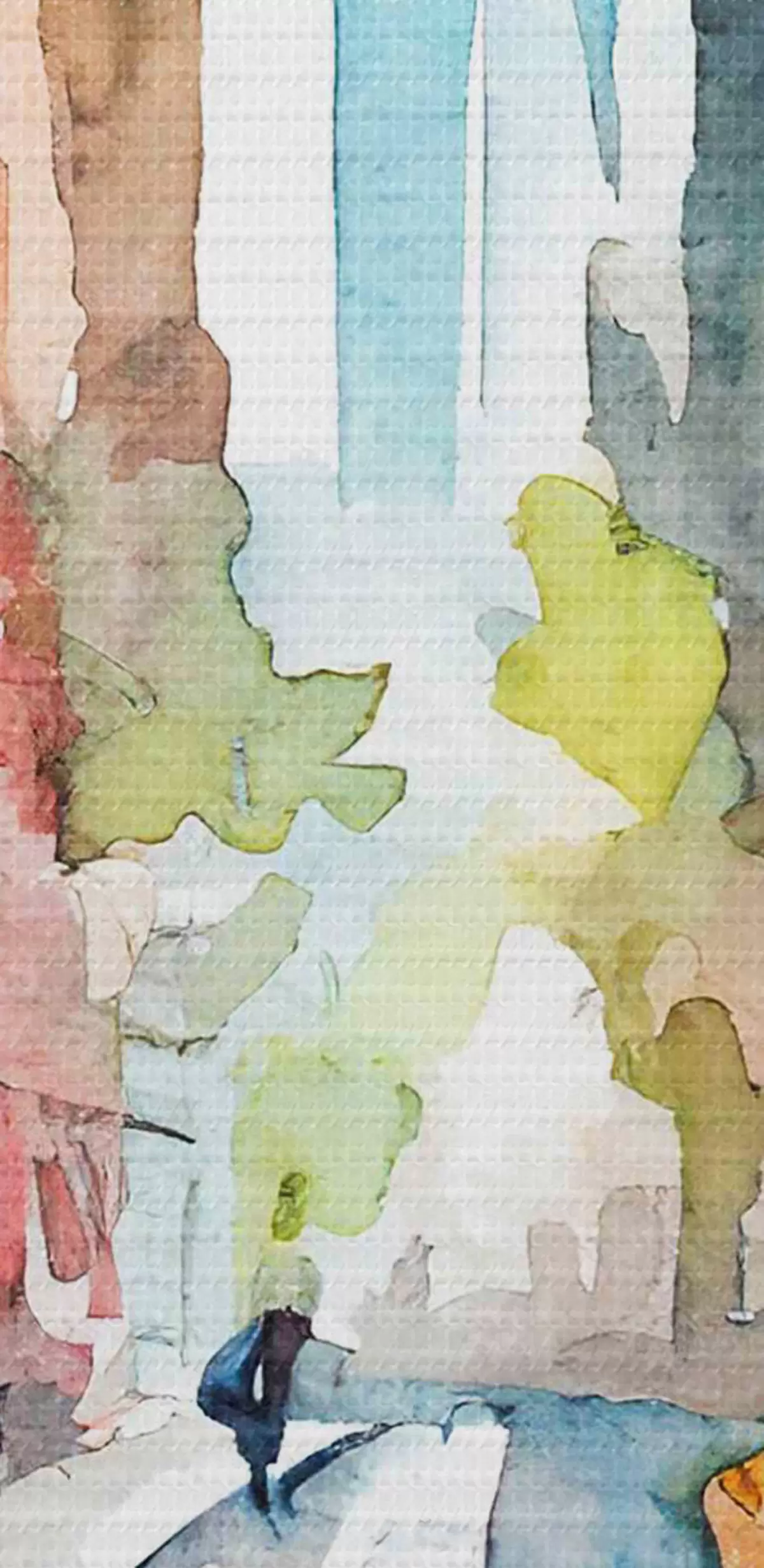 Kép Egy utcát ábrázoló akvarell, épületekkel és egy magas toronnyal a háttérben Nr r37346