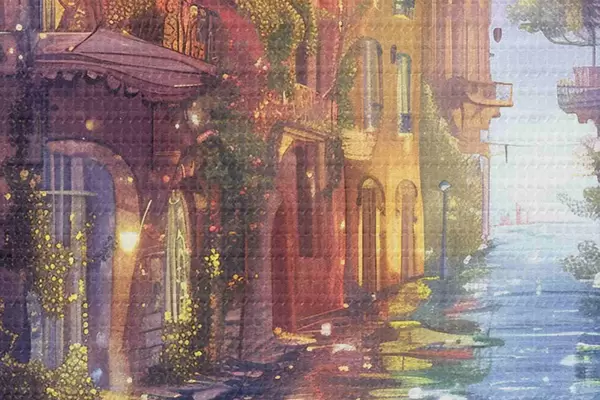 Ahhoz, hogy a vásznat a feszítőrúdra feszítsük anélkül, hogy a kép megsérülne, tükrözött képet használunk.