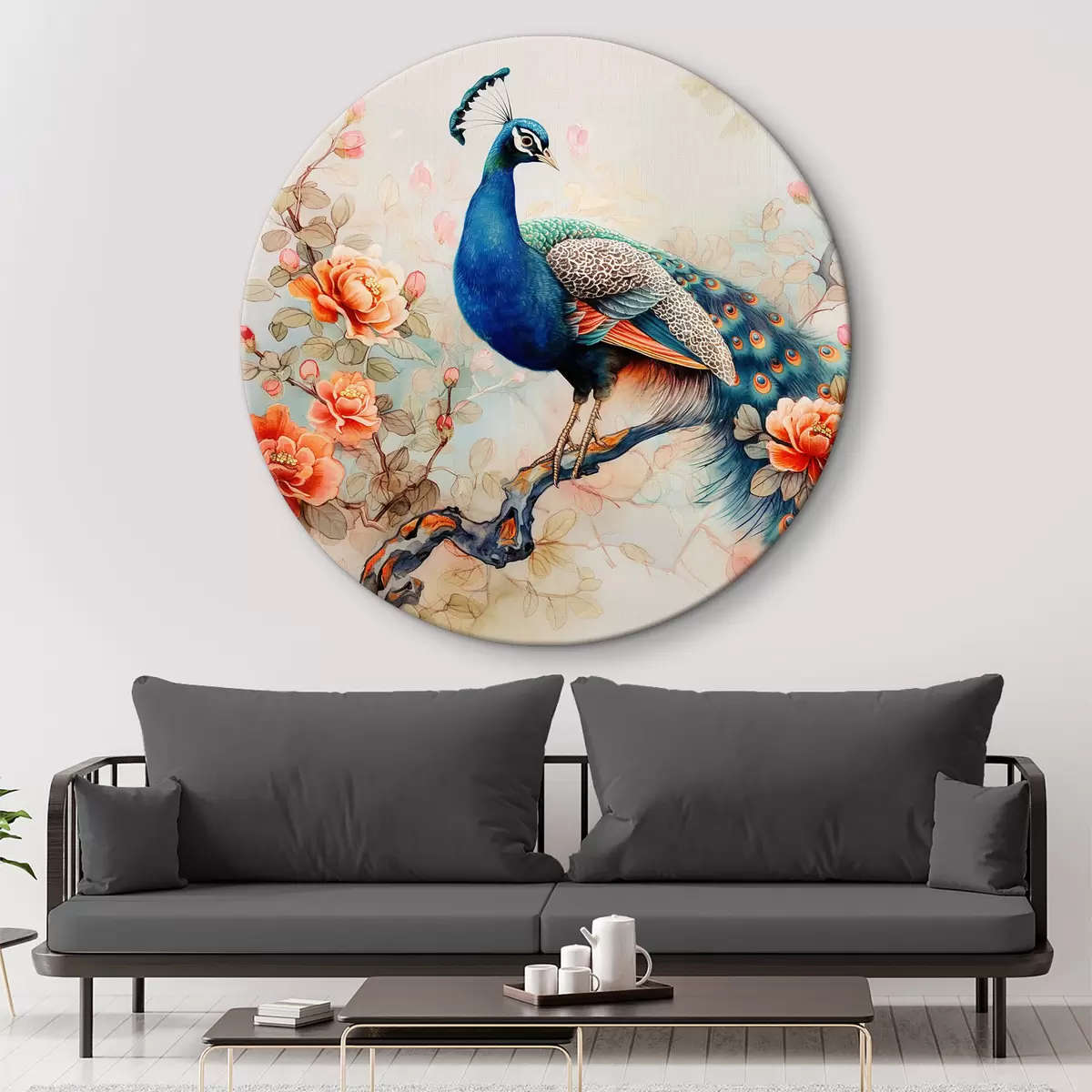 Kép Egy pávát ábrázoló festmény egy virágokkal díszített ágon Nr r38452