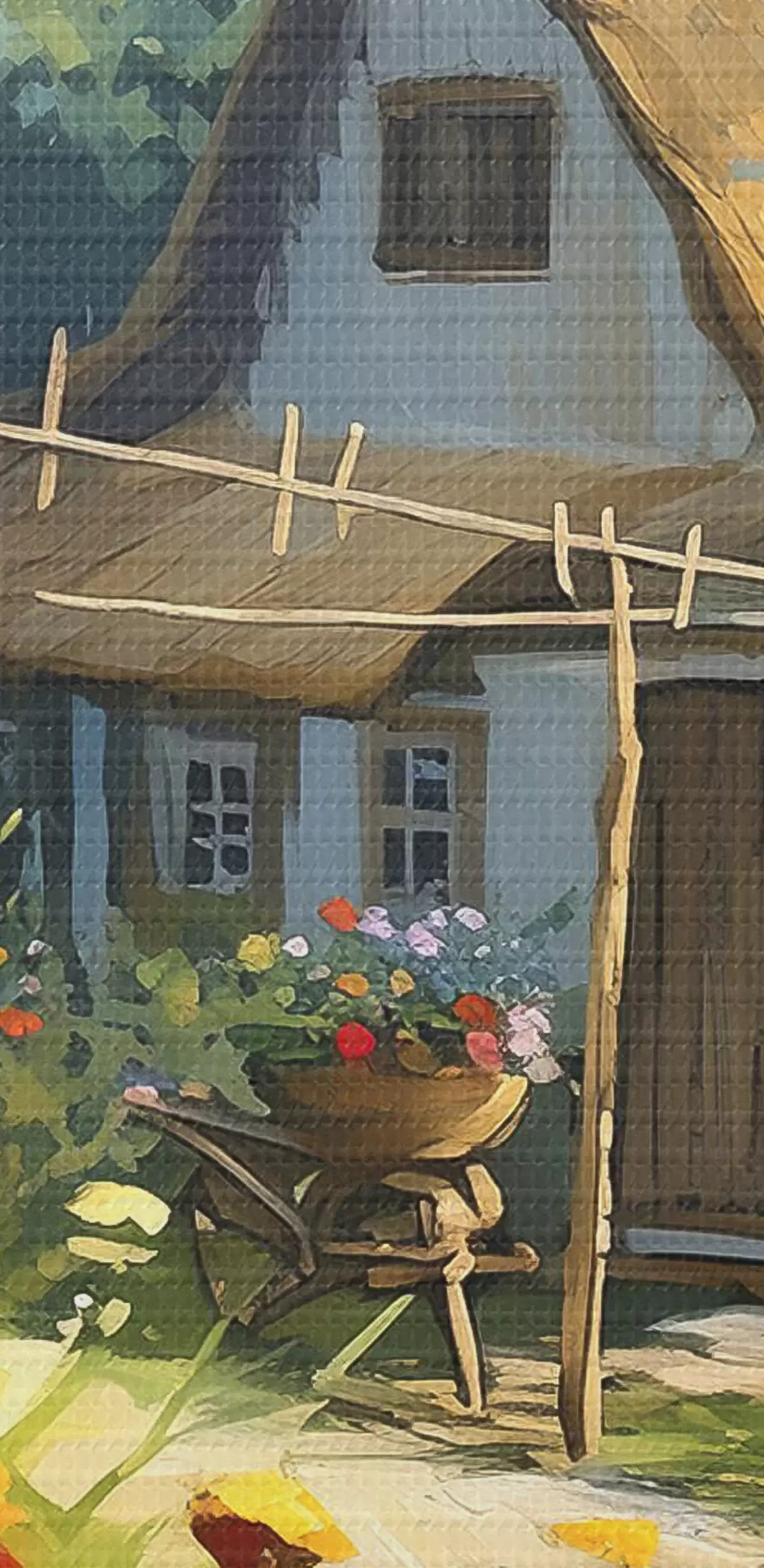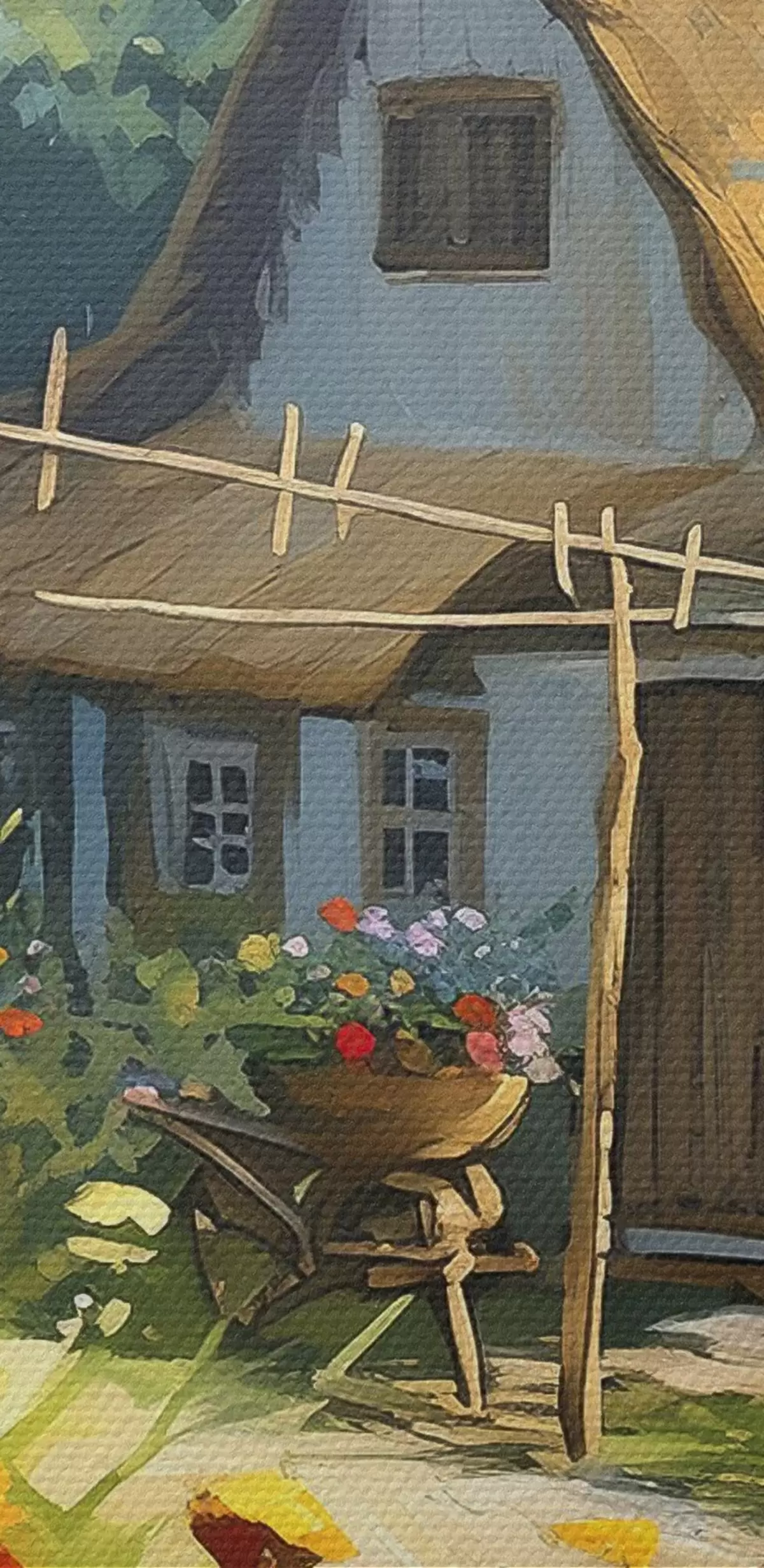 Kép Falusi ház kerttel, nyári virágokkal, olajfestékkel, ecsetvonásokkal, mezővel, rusztikus stílusban Nr r38491