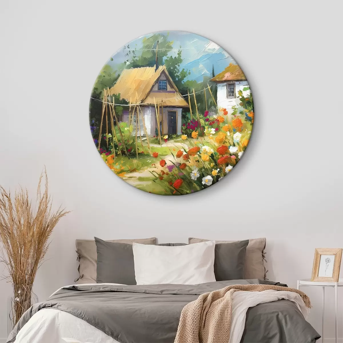 Kép Nyári kert virágokkal, parasztház, kék ég, olajfesték ecsetvonásokkal Nr r38494