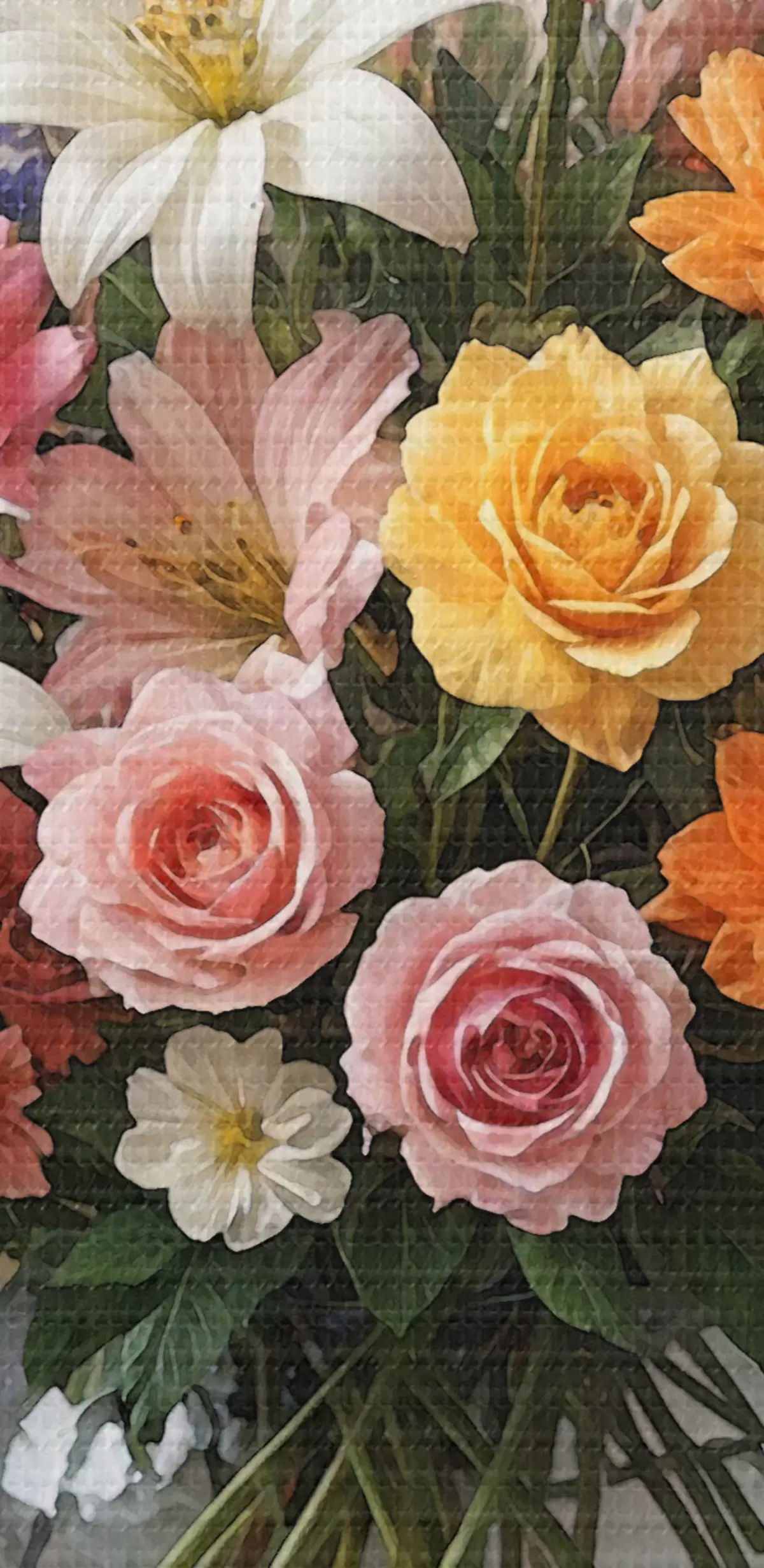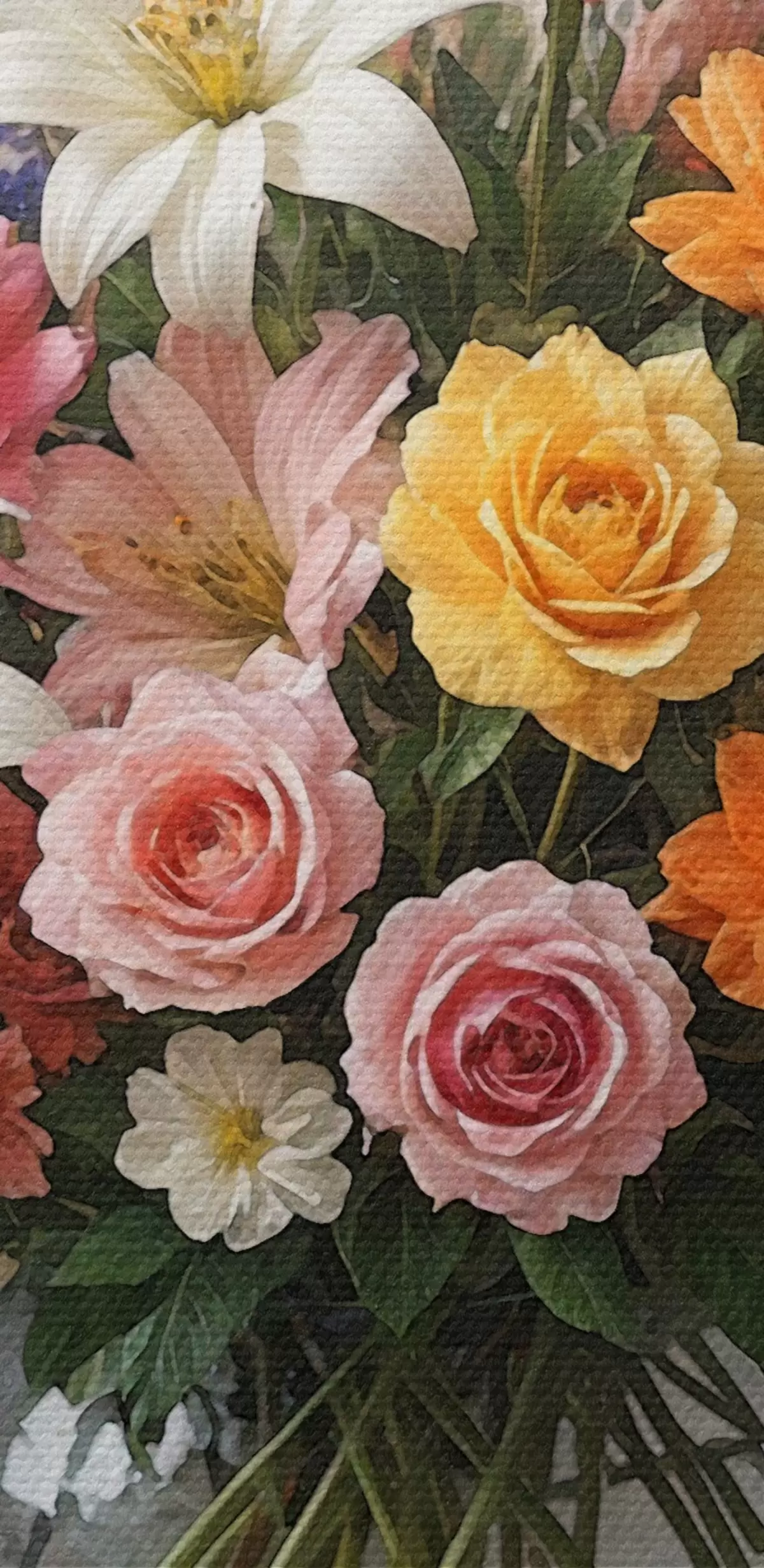 Kép Különböző színes virágok élénk csokor üvegvázában, fehér terítőn, festmény vintage Nr r38825