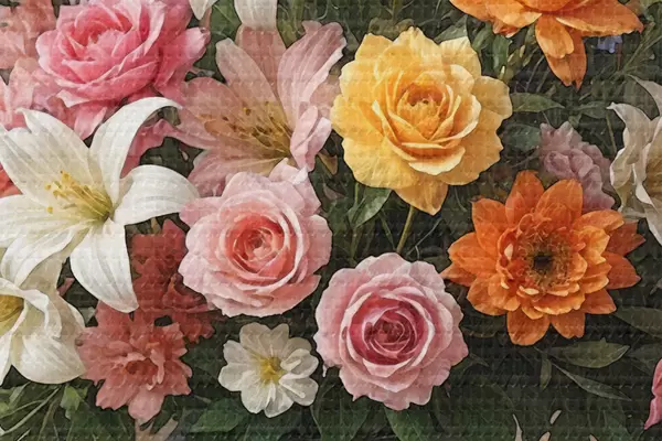 Kép Különböző színes virágok élénk csokor üvegvázában, fehér terítőn, festmény vintage Nr r38825